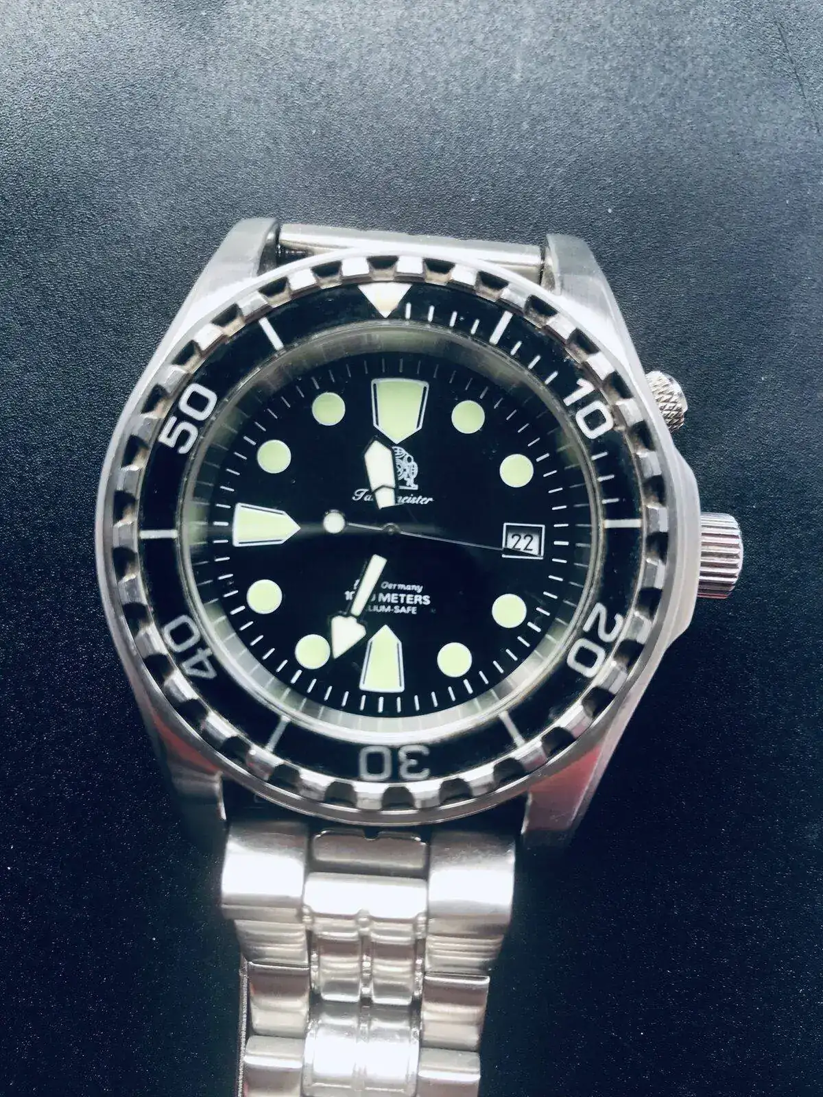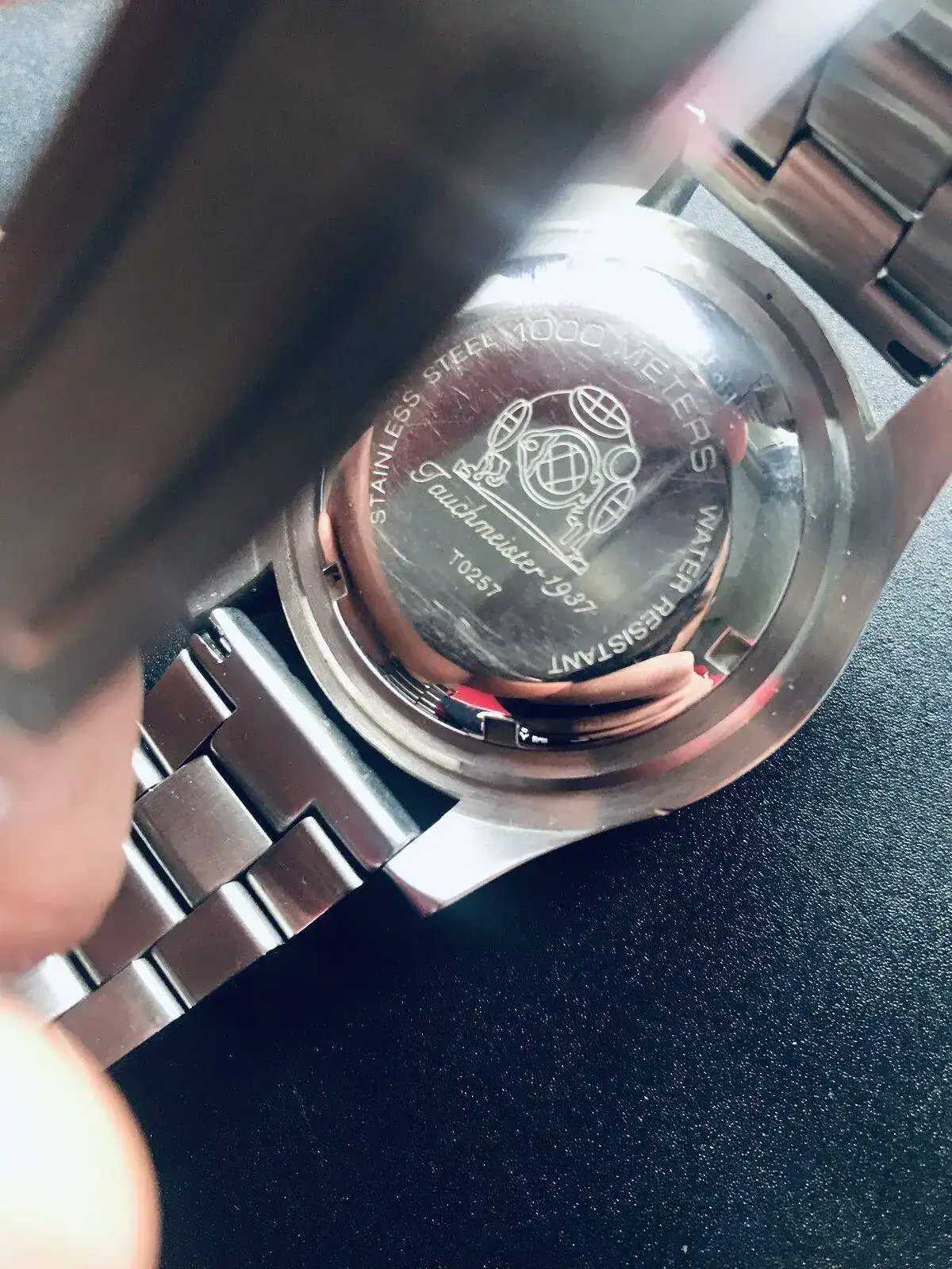 Hola, me han regalado un Tauchmeister Diver de segunda mano ,en el dial se puede leer 1000 metres helium safe. Es un reloj robusto pesa mucho y es grande 45 mm sin contar corona. La cebolla es roscada es automático pero admite cuerda manual. No conozco esta marca ni que maquinaria usa este reloj ,lo probaré estos días para saber que tal marcha. No soy muy fan de los relojes grandes haber si me acostumbro a tenerlo puesto en la muñeca.
