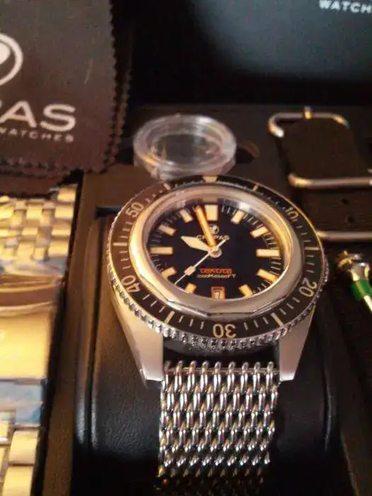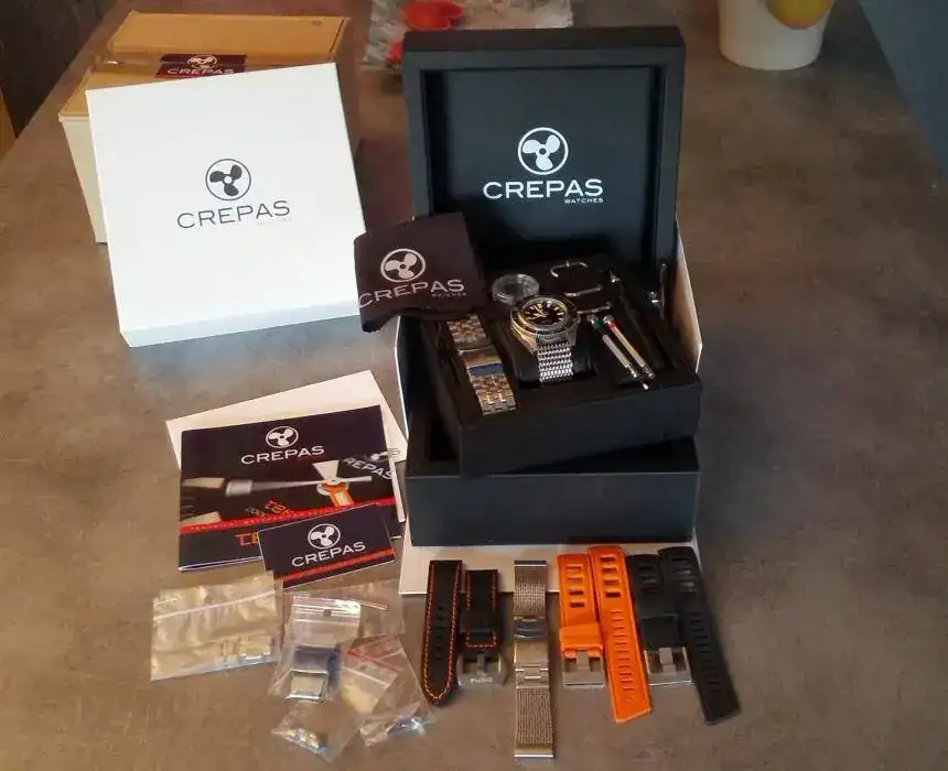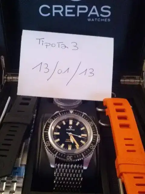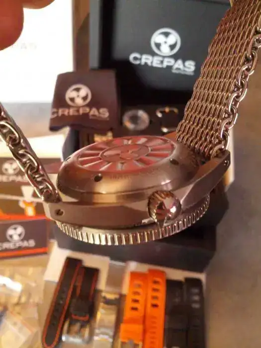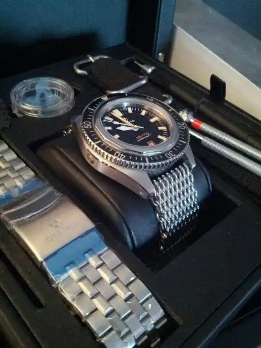 Además de su lote completo (cajas, cierre extra, herramientas, destornilladores, documentación completa, tarjeta) trae todos los extras: caucho negro y naranja (los 2 para estrenar), 2 milanesas (la original y la del Legrand), nato, armis original para estrenar sigue envuelto en plástico, correa de tiburón negra Jacobo para estrenar también.