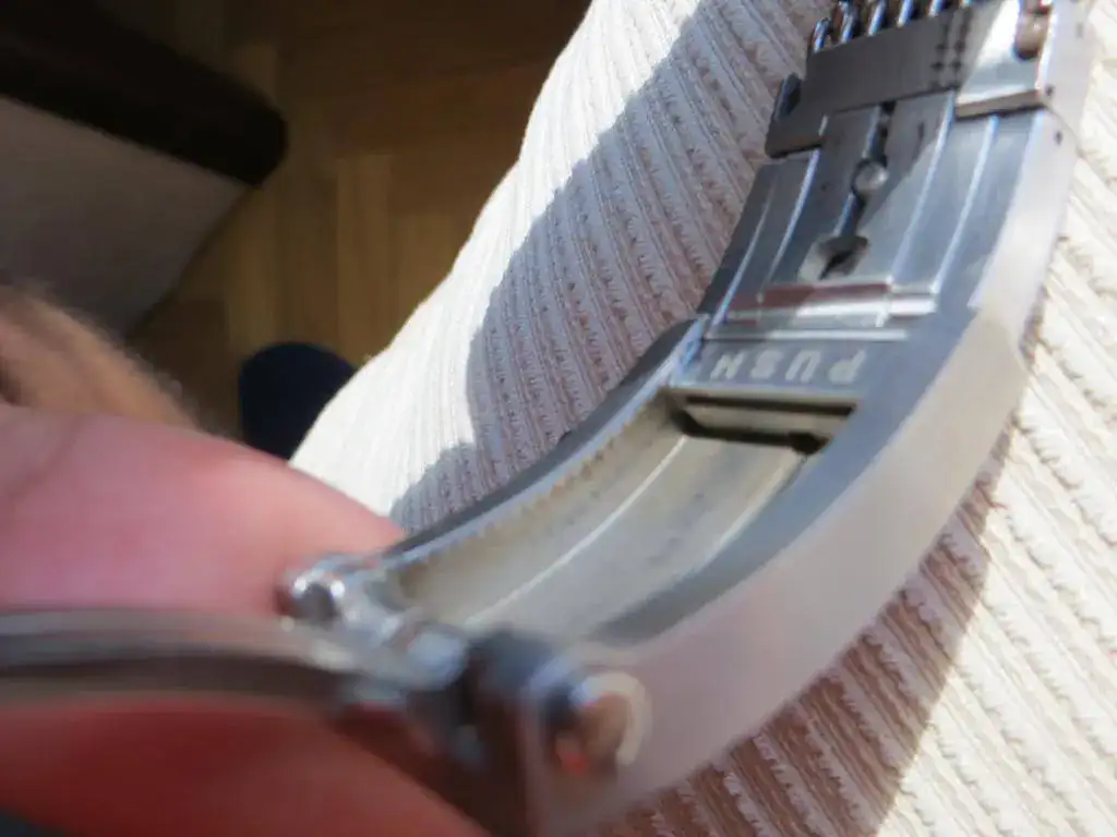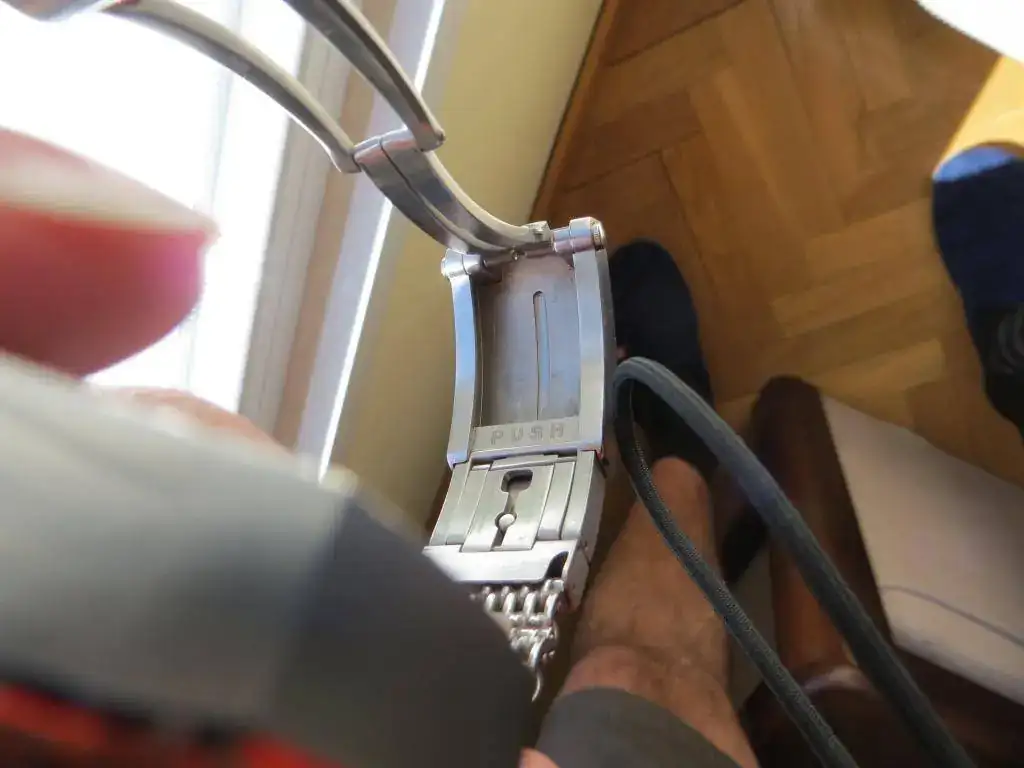 A continuación os pongo unas fotos del cierre del Omega Ploprof 1200. Este reloj ha sido usado en baños en mar y piscina durante un par de veranos (siendo aclarado con agua dulce y jabón tras los baños diariamente) y empieza a presentar cierta pátina a lo largo del interior del cierre, e incluso óxido en algunos recovecos, en especial en puntos de fricción del microajuste y la parte opuesta ala extensión de buceo