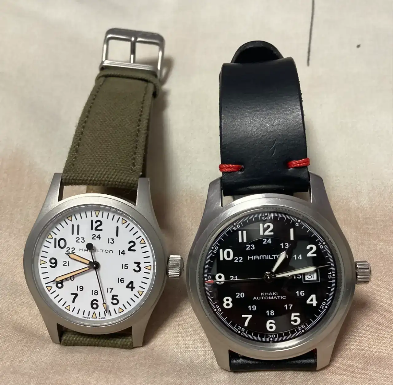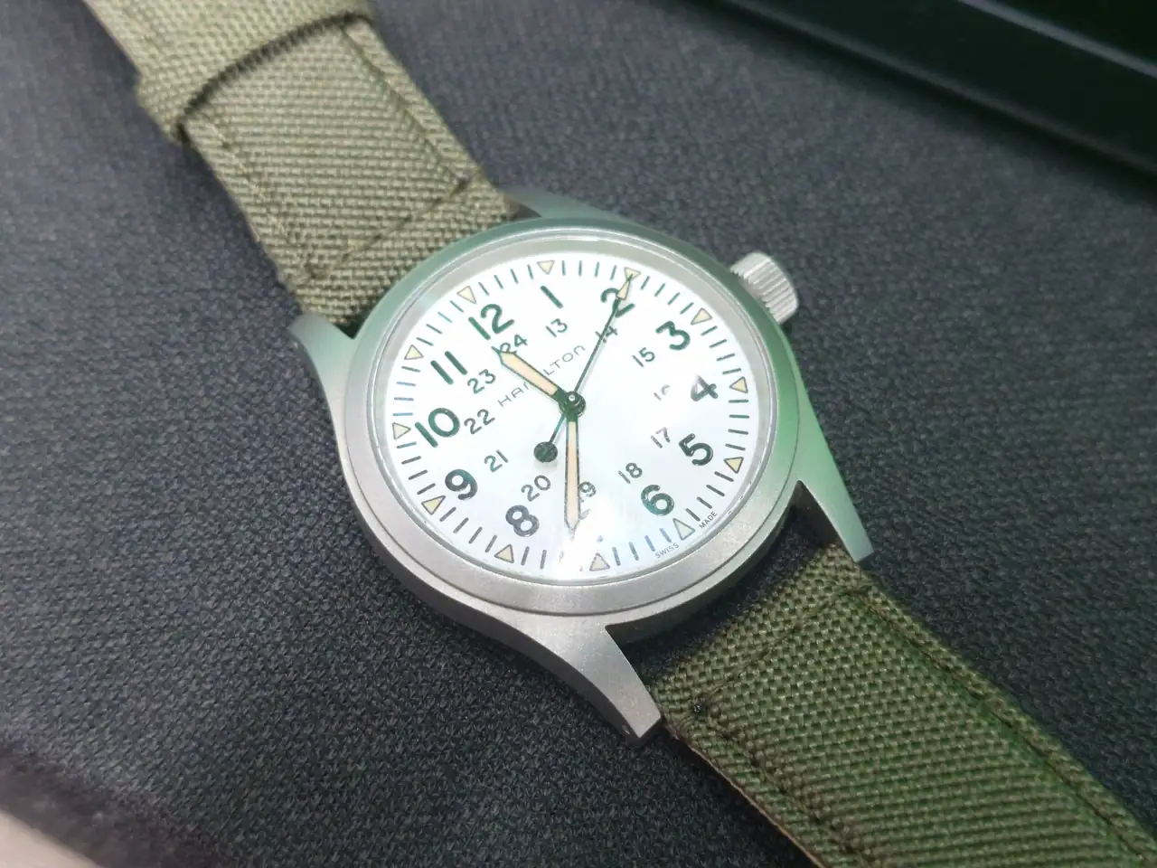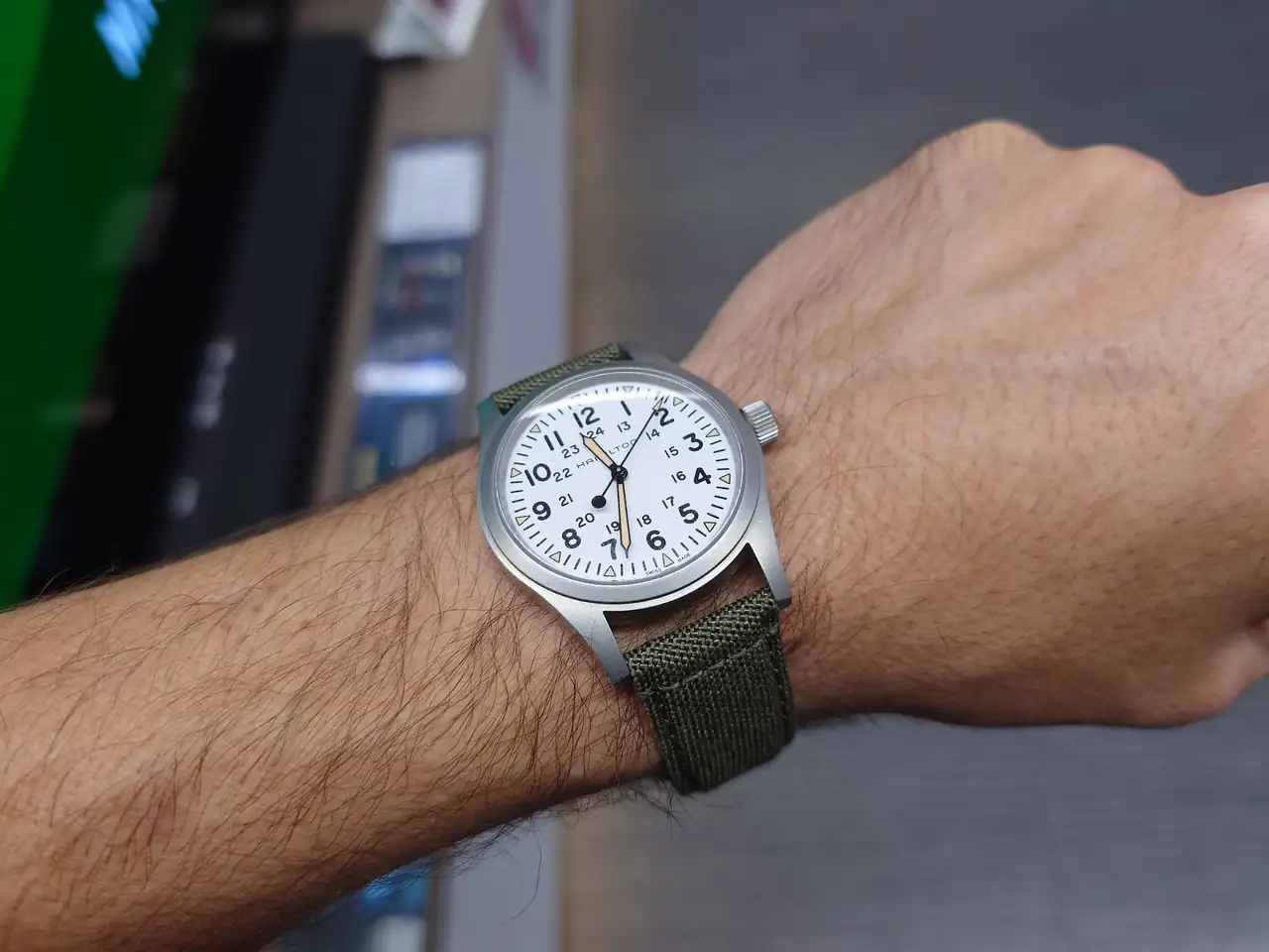 Hola, te refieres al blanco de 38 o al negro de 42?Ese mismo khaki lo he estado usando estos días con esa misma correa (es de Amazon, no?) y no me ha terminado de convencer... He vuelto a la nato, el que los agujeros de la correa estén tan al límite de las asas hace que se vea un hueco demasiado grande y no me acababa de gustar)