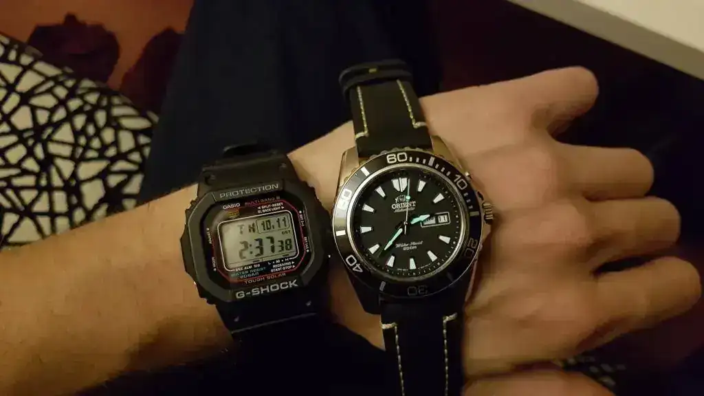 Exactamente el mismo que tengo yo. Ya he fastidiado algún otro por un golpe inesperado. Así que cuando llego a casa, me Quito el del curro y a la muñeca el GSHOCK que no es muy tocho (por eso elegí este modelo) y que lo aguanta todo.En mi caso, para estar en casa y trabajar, utilizo un Casio G-Shock 5610 Radiocontrolado. No me lo quito ni para dormir, ni para ducharme, ni nada.