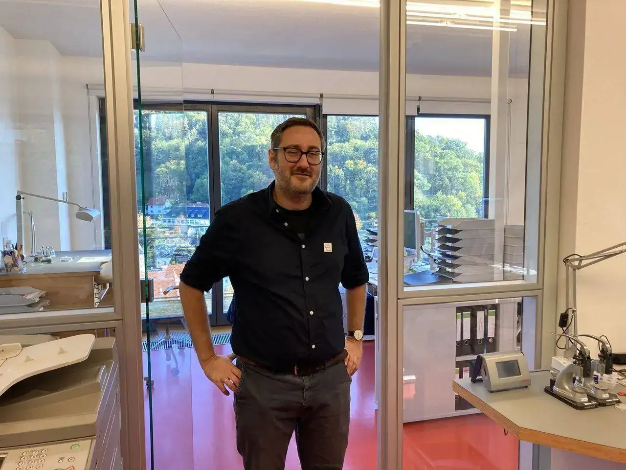 Primera parada, el edificio de Cronometría, donde los calibres de Nomos son no sólo pensados sino también construidos. Es decir, el departamento de I+D junto al atelier de montaje. Nos recibe Theo Prenzel, el jefe precisamente de I+D, responsable del calibre automático DUW 3001 y del mecanismo que permite cambiar la fecha hacia adelante o hacia atrás indistintamente. A mi pregunta de si hay nuevos calibres en camino sólo sonríe, y ya cuando le pregunto directamente si entre ellos hay un cronógrafo me dice que él no puede hablar sobre esas cosas ¿lo tomamos como un sí?