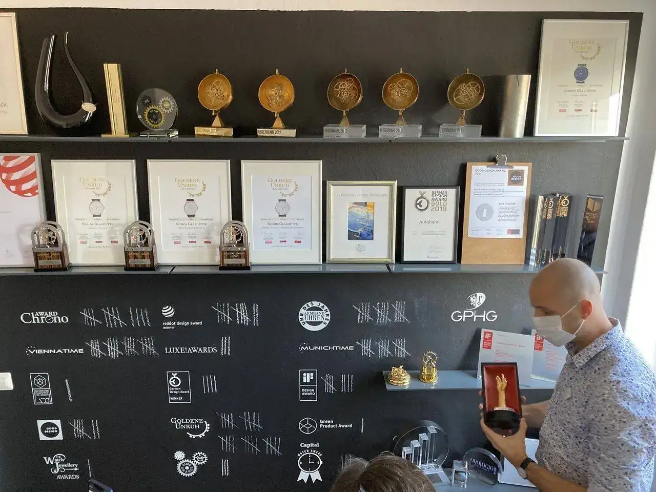 La "sala de trofeos" está ubicada en un rellano de la escalera que comunica los distintos pisos. Cuentan los premios por palotes, aunque del que están más orgullosos es del "Challenge" del GPHG de 2018 por el Tangente Update (Sí, ese con la fecha perimetral...). Es uno de los dos únicos premios otorgados a relojes no suizos.