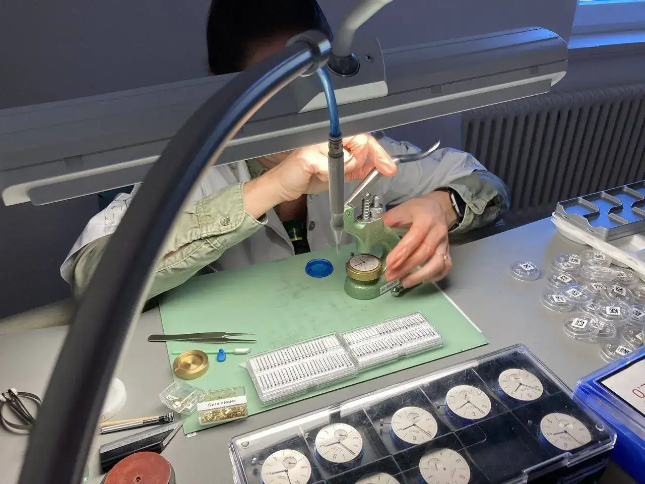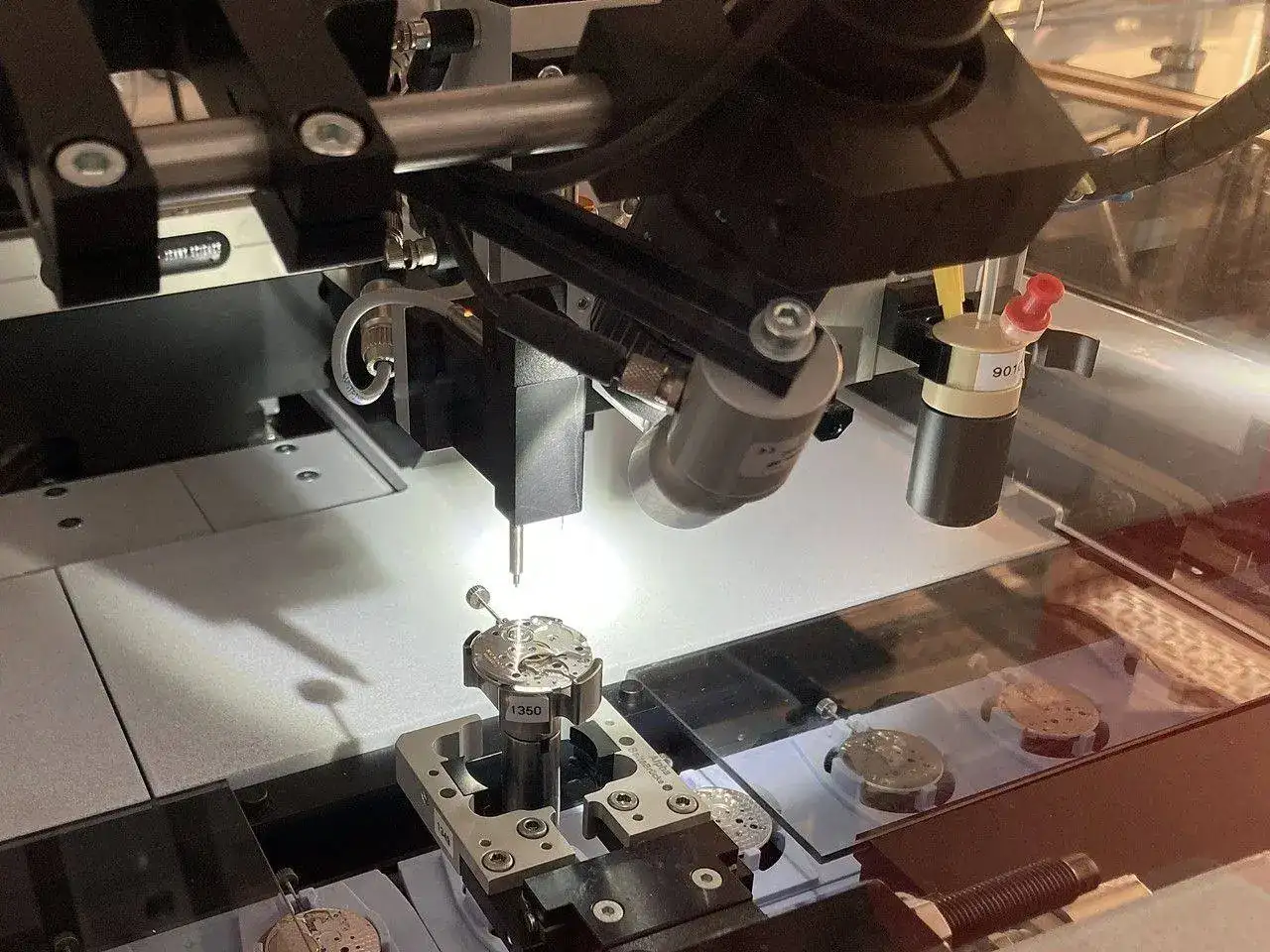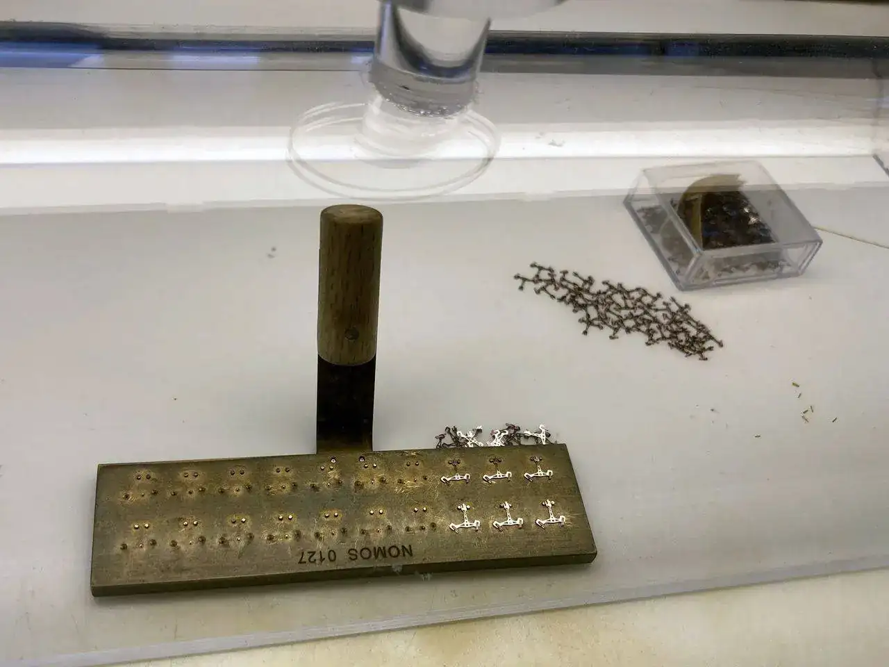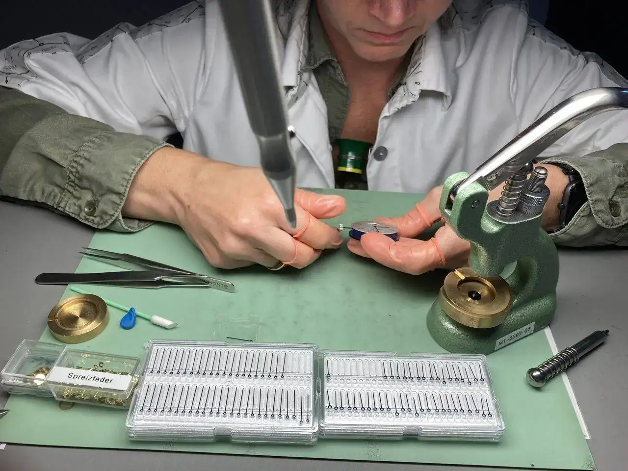 Si alguno de los muelles tiene una espira fuera de sitio, se rectifica también a mano. Se necesita una habilidad especial, además de un entrenamiento específico y un microscopio (y una varilla doblada), para poder realizar esta tarea con éxito.