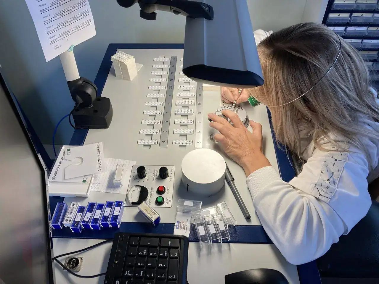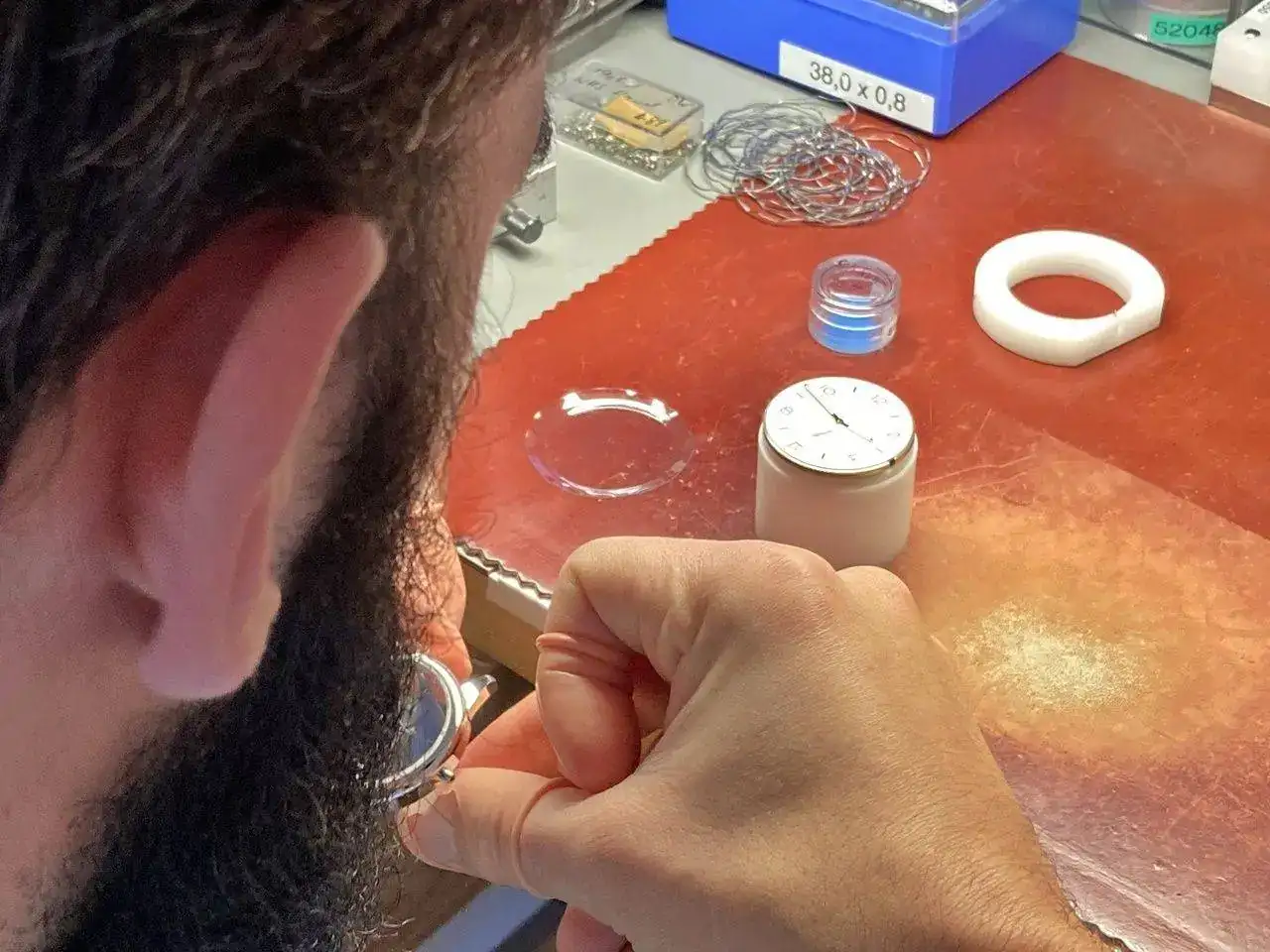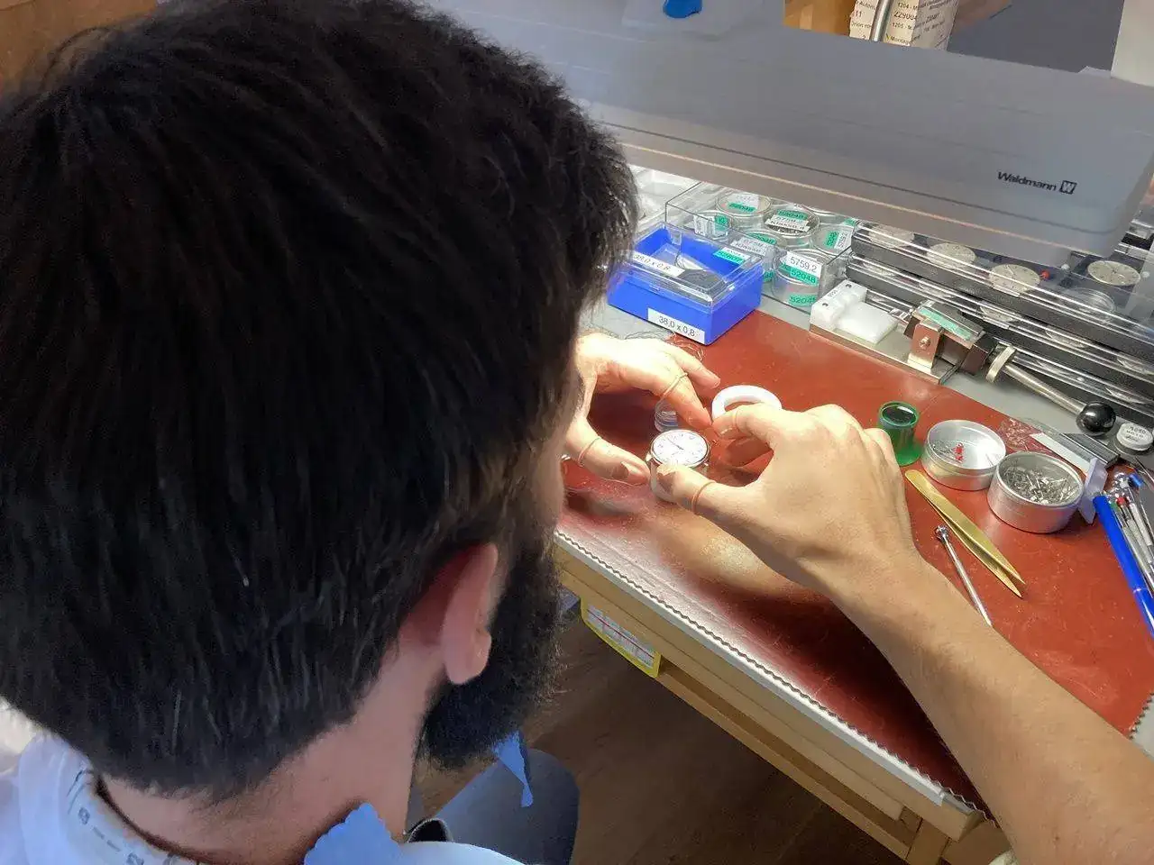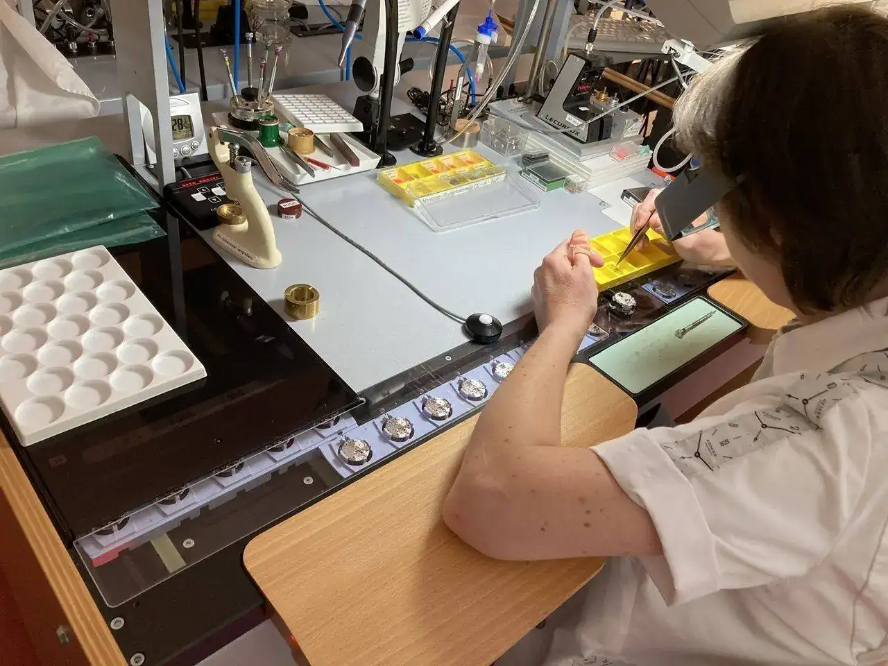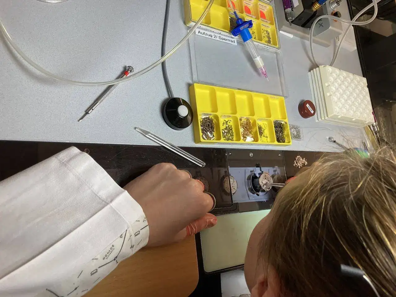Si alguno de los muelles tiene una espira fuera de sitio, se rectifica también a mano. Se necesita una habilidad especial, además de un entrenamiento específico y un microscopio (y una varilla doblada), para poder realizar esta tarea con éxito.