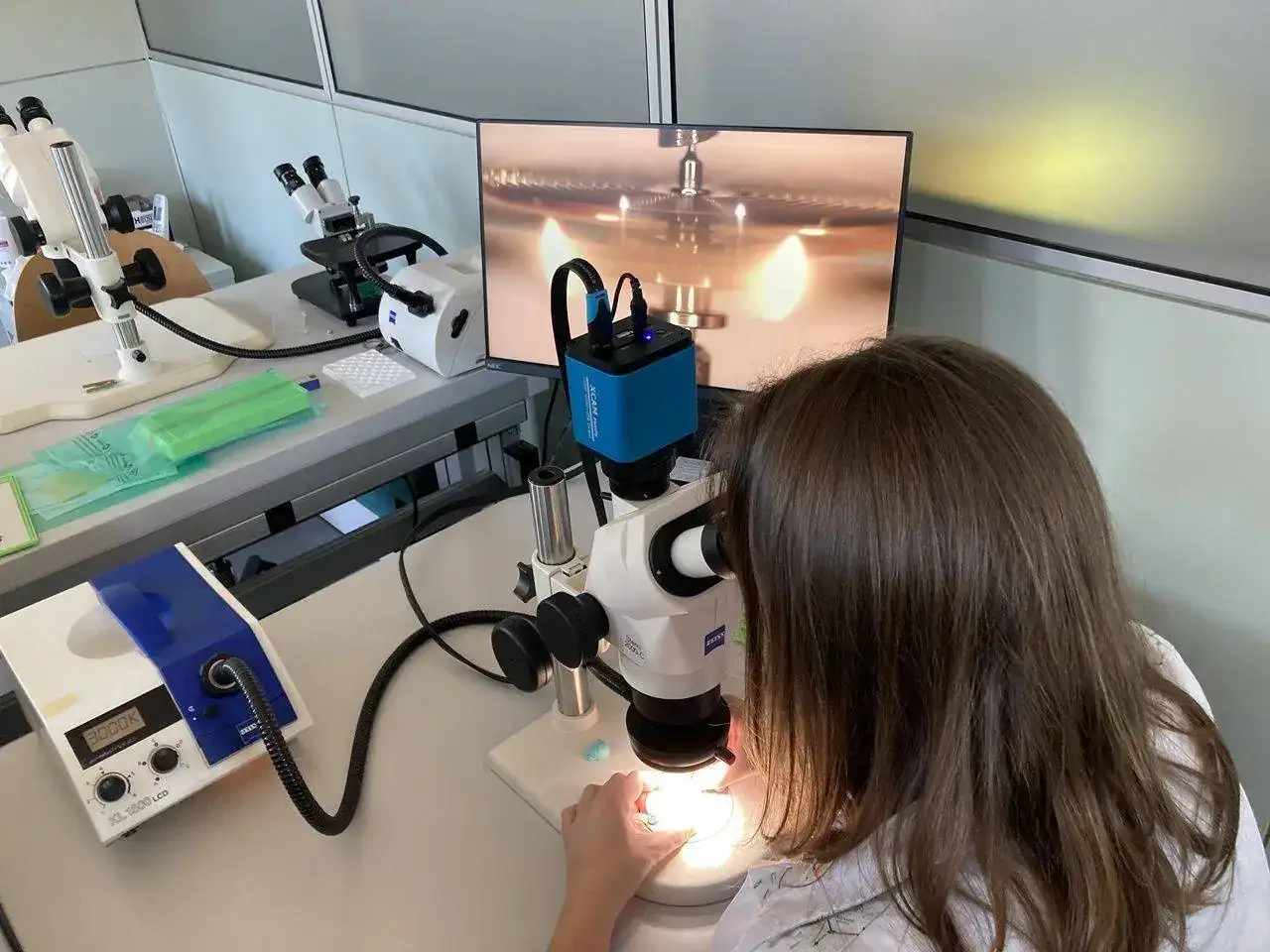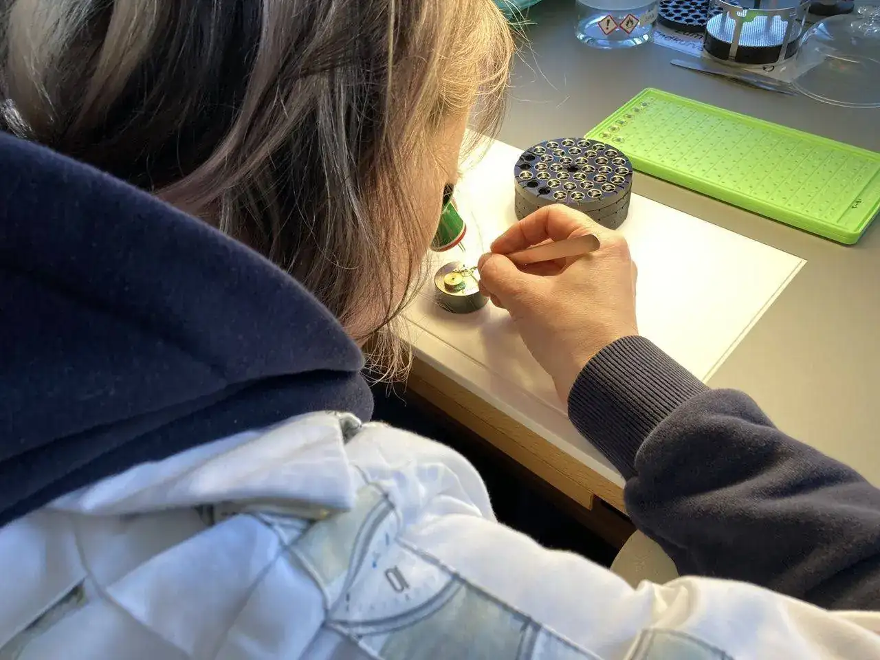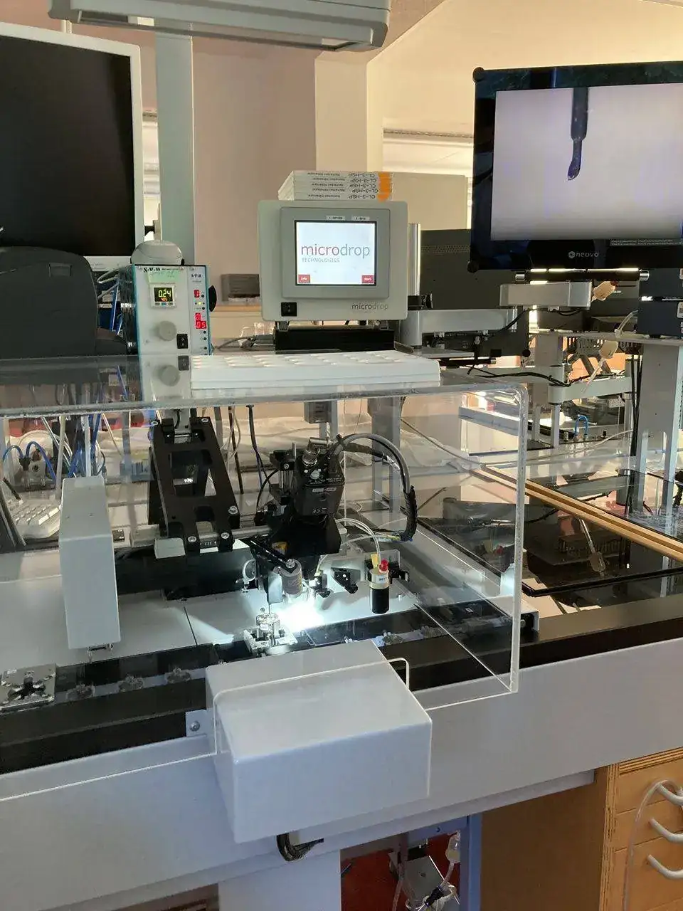 No todo se hace estrictamente a mano. Por ejemplo, el lubricado. Como se necesita depositar una cantidad exacta de aceite, medida en nanolitros, se encomienda esa tarea al Microdrop.