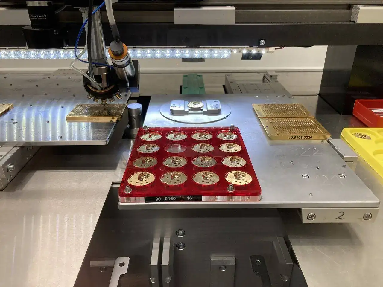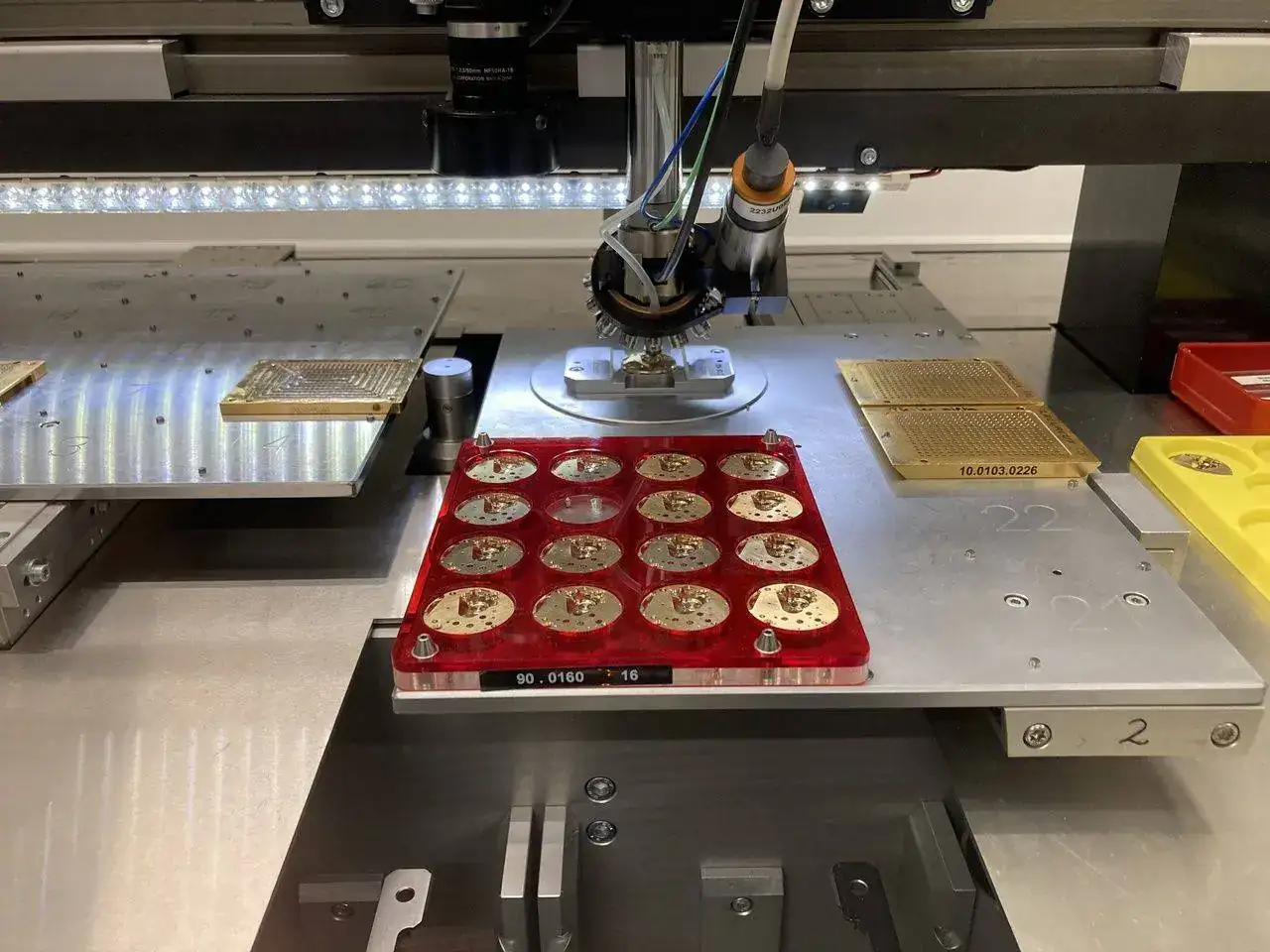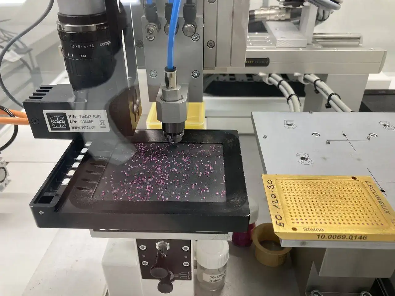 Antes, otra máquina ha preparado los rubíes ordenados por cara y por tamaños. Estas dos acciones se producen en la fábrica de componentes, que veremos más adelante.