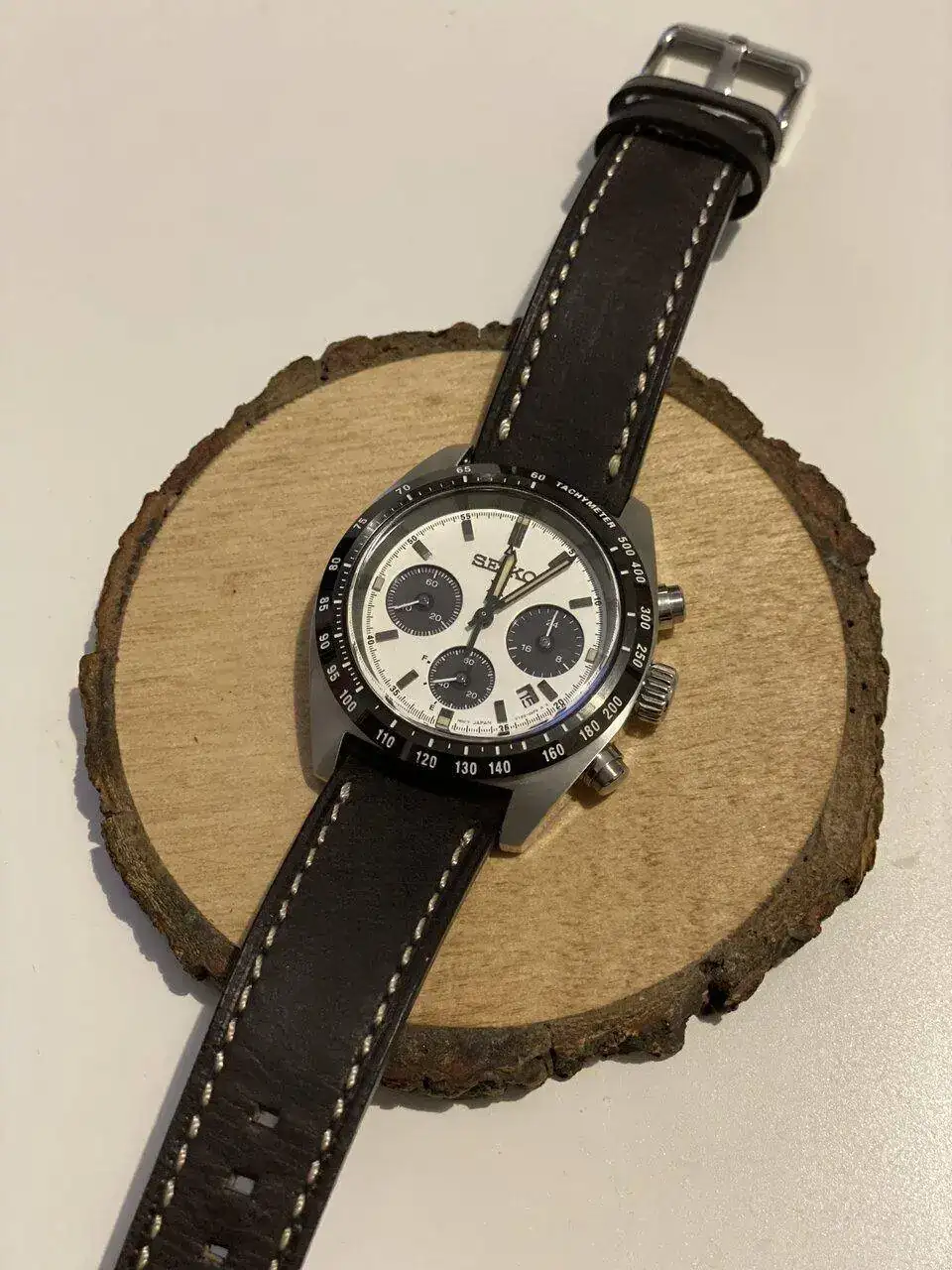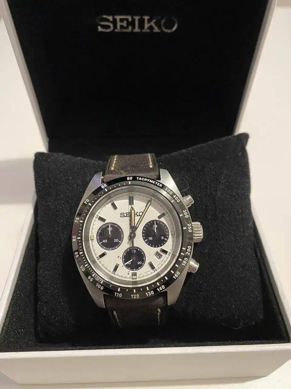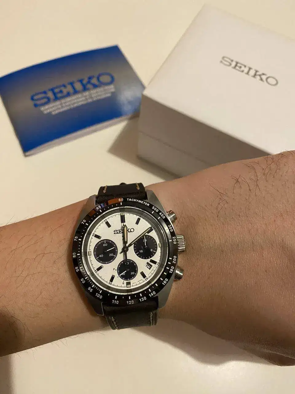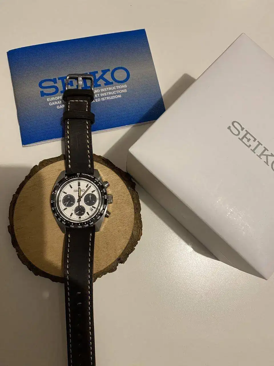 Pues lo dicho, llegada ayer del más que visto por estos lares, Seiko Speedtimer, alias “Seitona”. Después de la última entrada del Sumo verde, pensé que no iba a entrar ningún Seiko más a corto plazo por tener ya dos, pero al final ha vuelto a caer. Me apetecía algo con esfera blanca, y los diales panda siempre me han gustado(y a quién no!?), por lo que echando vistazos por aquí y por allá, vi uno muy bien de precio, sin el brazalete original, pero con una correa de cuero marrón y más de un año de garantía todavía. Lo típico, le regateé por el hecho de no tener el armis, y al final cayó. Por supuesto, también la suerte de encontrar a otra persona que vendía el brazalete suelto tirado de precio, así que a la espera también de recibirlo. Hasta último momento estuve dudando de si coger ésta o la Jubilee de Strapcode, ya que estéticamente lo veía más especial con el reloj, pero me hubiera salido por más del doble de precio, así que de momento lo he aparcado, aunque tampoco la descarto para un futuro. Los 39mm de caja le dan un equilibrio estupendo y, sinceramente en este caso, creo que es ideal y mejor que el último de 41 que han sacado.