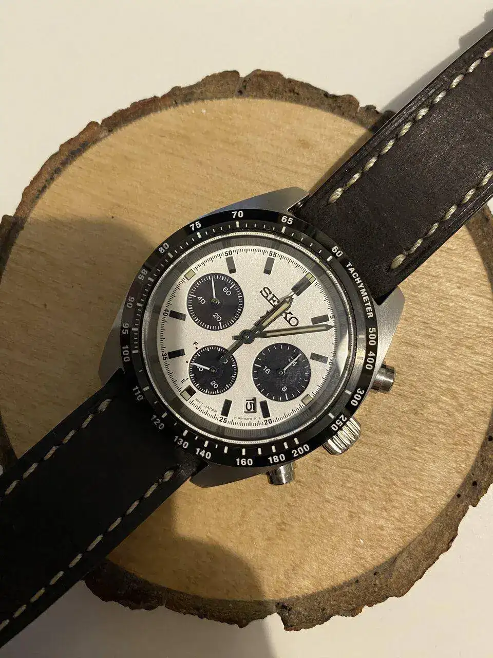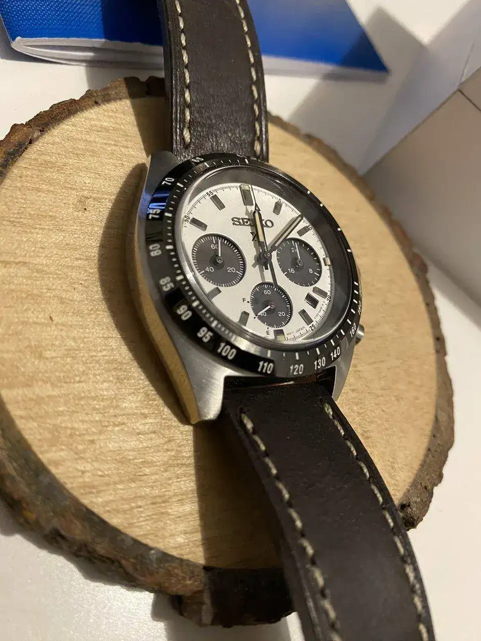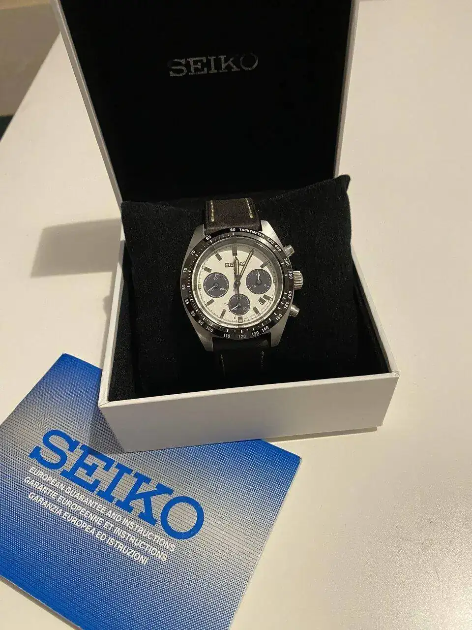 Pues lo dicho, llegada ayer del más que visto por estos lares, Seiko Speedtimer, alias “Seitona”. Después de la última entrada del Sumo verde, pensé que no iba a entrar ningún Seiko más a corto plazo por tener ya dos, pero al final ha vuelto a caer. Me apetecía algo con esfera blanca, y los diales panda siempre me han gustado(y a quién no!?), por lo que echando vistazos por aquí y por allá, vi uno muy bien de precio, sin el brazalete original, pero con una correa de cuero marrón y más de un año de garantía todavía. Lo típico, le regateé por el hecho de no tener el armis, y al final cayó. Por supuesto, también la suerte de encontrar a otra persona que vendía el brazalete suelto tirado de precio, así que a la espera también de recibirlo. Hasta último momento estuve dudando de si coger ésta o la Jubilee de Strapcode, ya que estéticamente lo veía más especial con el reloj, pero me hubiera salido por más del doble de precio, así que de momento lo he aparcado, aunque tampoco la descarto para un futuro. Los 39mm de caja le dan un equilibrio estupendo y, sinceramente en este caso, creo que es ideal y mejor que el último de 41 que han sacado.