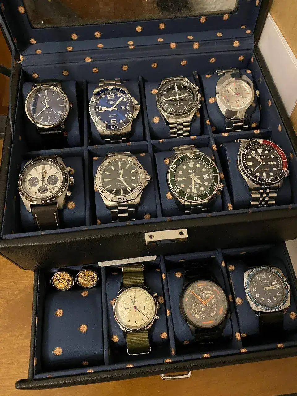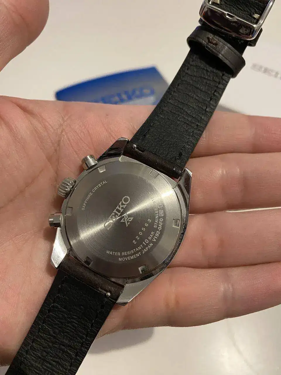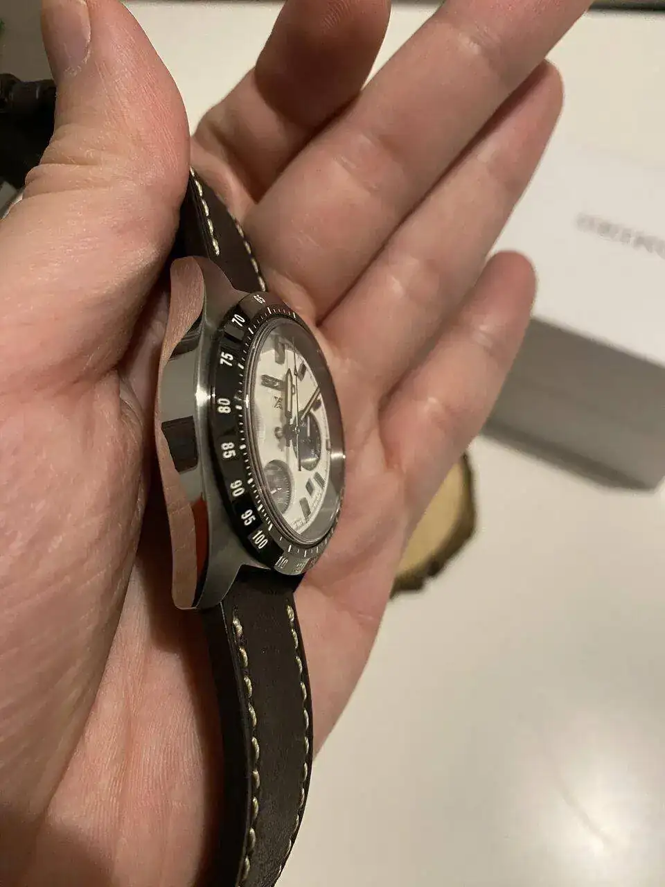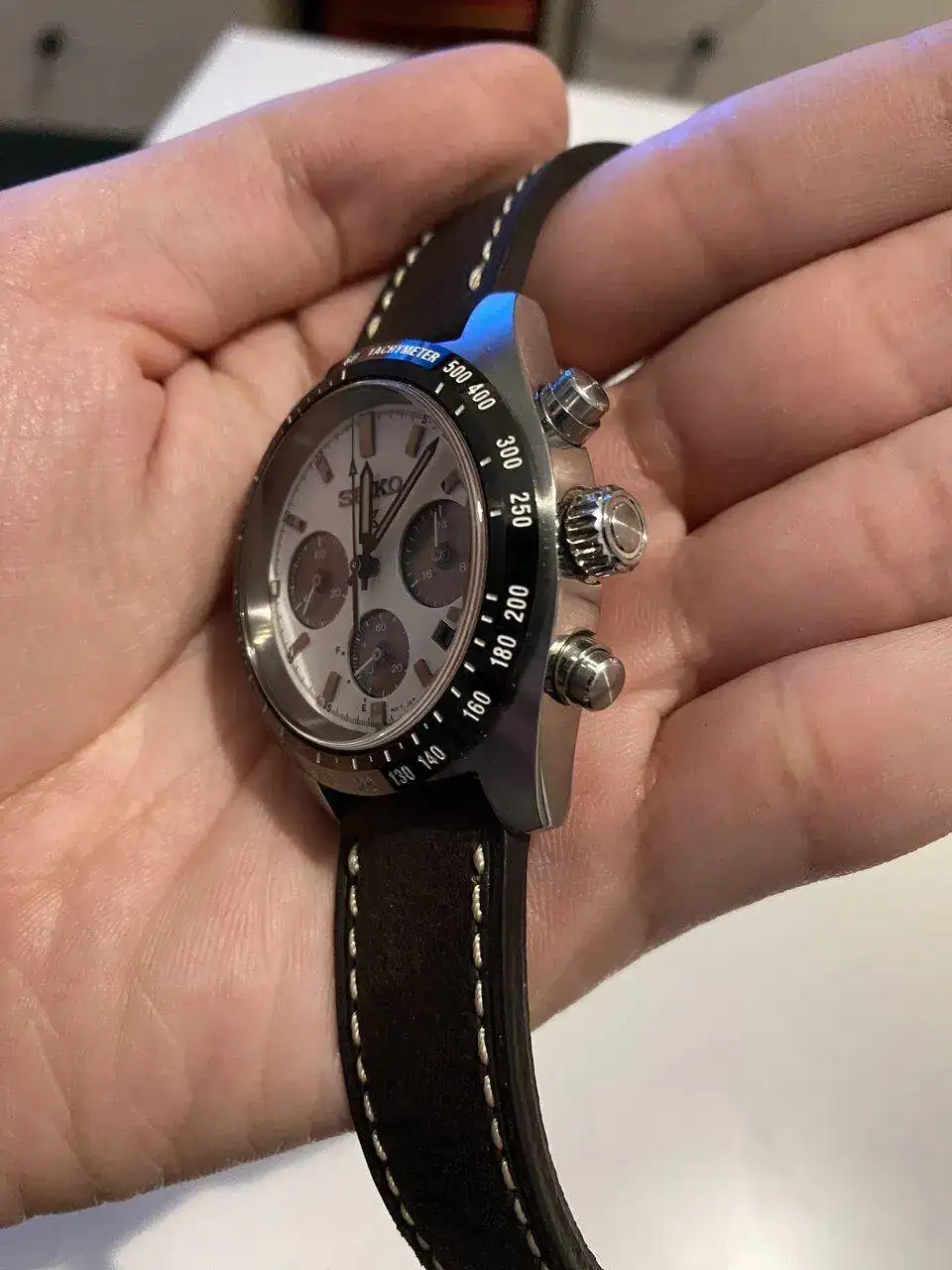 Pues lo dicho, llegada ayer del más que visto por estos lares, Seiko Speedtimer, alias “Seitona”. Después de la última entrada del Sumo verde, pensé que no iba a entrar ningún Seiko más a corto plazo por tener ya dos, pero al final ha vuelto a caer. Me apetecía algo con esfera blanca, y los diales panda siempre me han gustado(y a quién no!?), por lo que echando vistazos por aquí y por allá, vi uno muy bien de precio, sin el brazalete original, pero con una correa de cuero marrón y más de un año de garantía todavía. Lo típico, le regateé por el hecho de no tener el armis, y al final cayó. Por supuesto, también la suerte de encontrar a otra persona que vendía el brazalete suelto tirado de precio, así que a la espera también de recibirlo. Hasta último momento estuve dudando de si coger ésta o la Jubilee de Strapcode, ya que estéticamente lo veía más especial con el reloj, pero me hubiera salido por más del doble de precio, así que de momento lo he aparcado, aunque tampoco la descarto para un futuro. Los 39mm de caja le dan un equilibrio estupendo y, sinceramente en este caso, creo que es ideal y mejor que el último de 41 que han sacado.