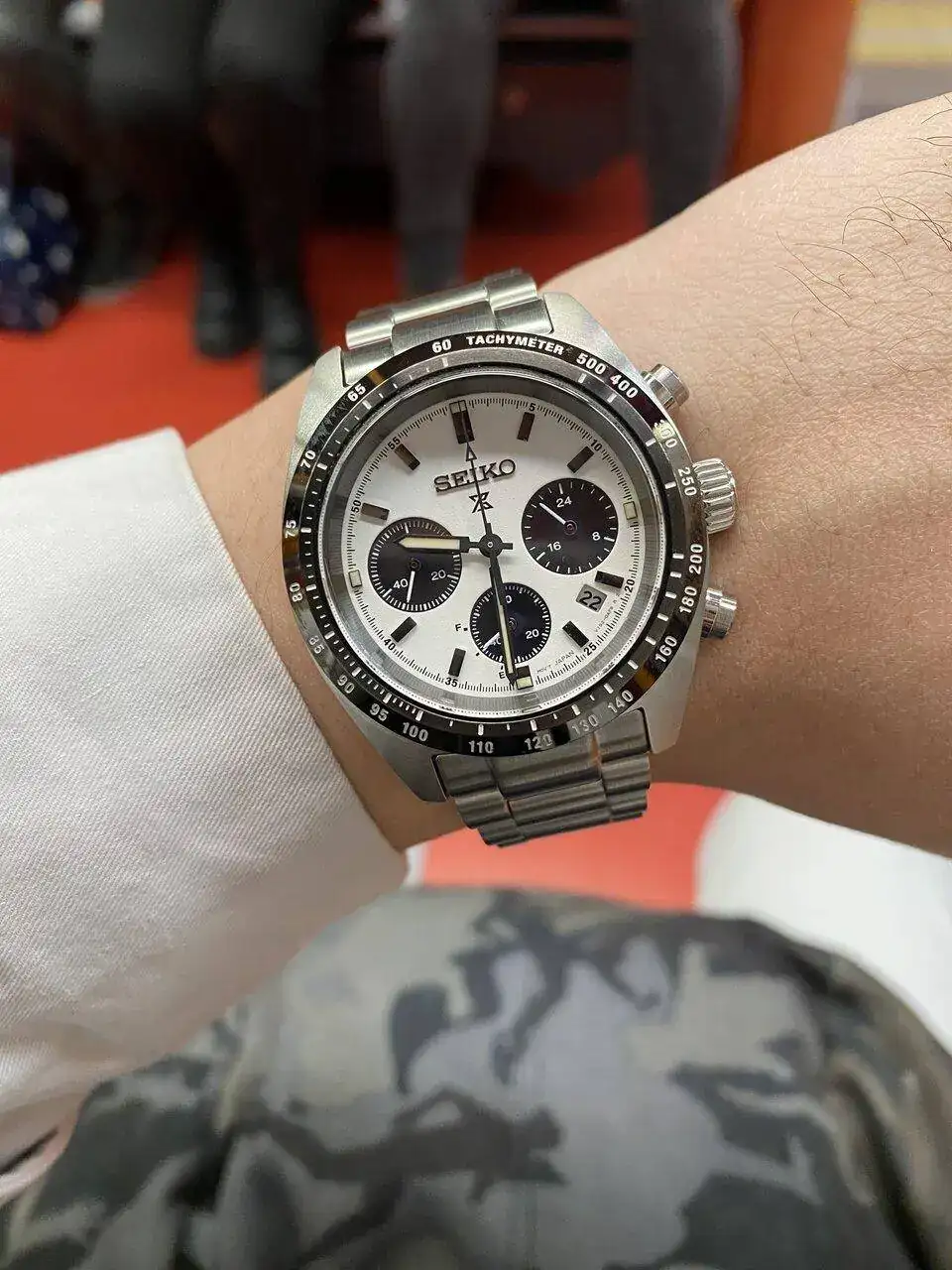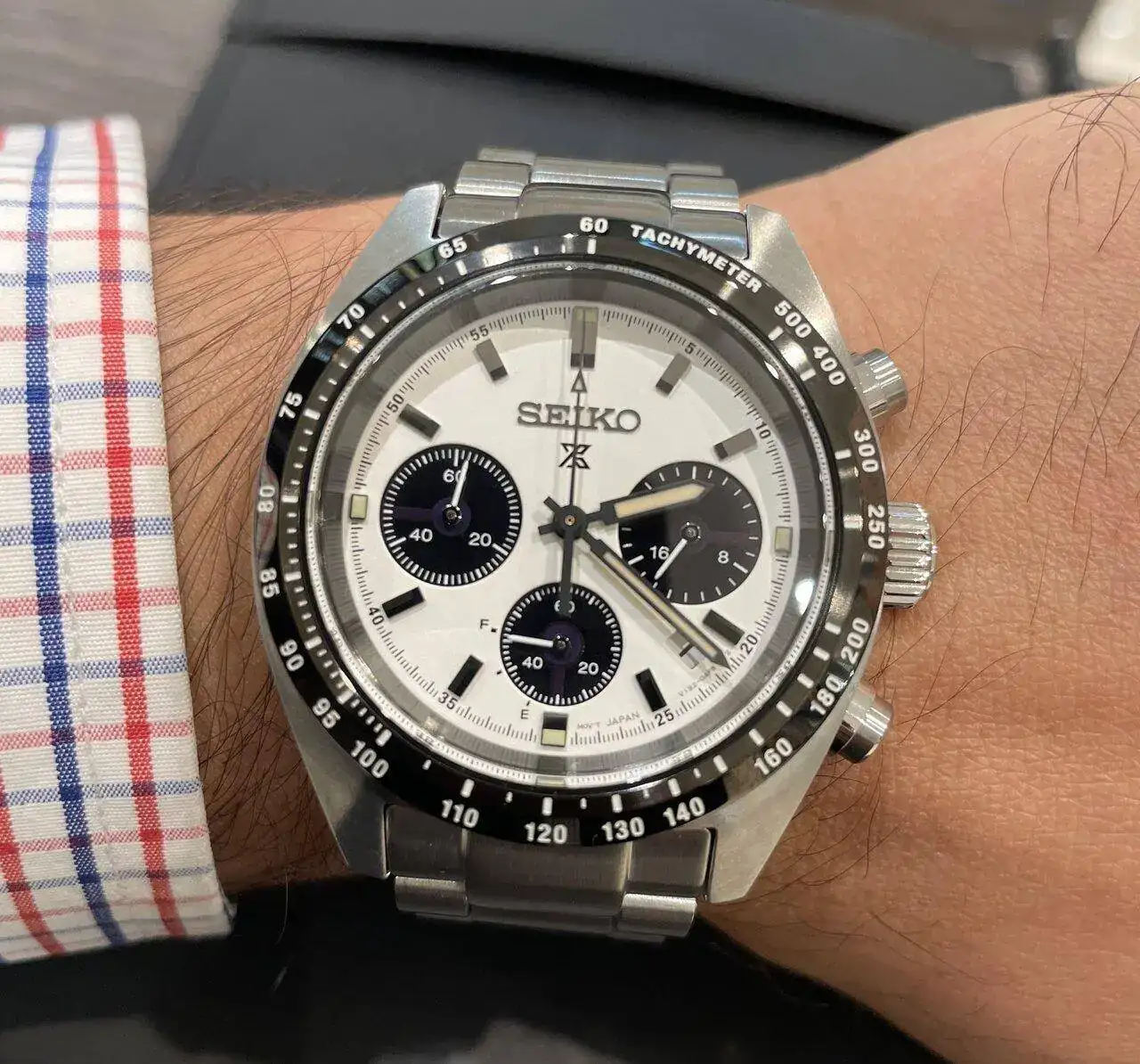 Pues lo dicho, llegada ayer del más que visto por estos lares, Seiko Speedtimer, alias “Seitona”. Después de la última entrada del Sumo verde, pensé que no iba a entrar ningún Seiko más a corto plazo por tener ya dos, pero al final ha vuelto a caer. Me apetecía algo con esfera blanca, y los diales panda siempre me han gustado(y a quién no!?), por lo que echando vistazos por aquí y por allá, vi uno muy bien de precio, sin el brazalete original, pero con una correa de cuero marrón y más de un año de garantía todavía. Lo típico, le regateé por el hecho de no tener el armis, y al final cayó. Por supuesto, también la suerte de encontrar a otra persona que vendía el brazalete suelto tirado de precio, así que a la espera también de recibirlo. Hasta último momento estuve dudando de si coger ésta o la Jubilee de Strapcode, ya que estéticamente lo veía más especial con el reloj, pero me hubiera salido por más del doble de precio, así que de momento lo he aparcado, aunque tampoco la descarto para un futuro. Los 39mm de caja le dan un equilibrio estupendo y, sinceramente en este caso, creo que es ideal y mejor que el último de 41 que han sacado.