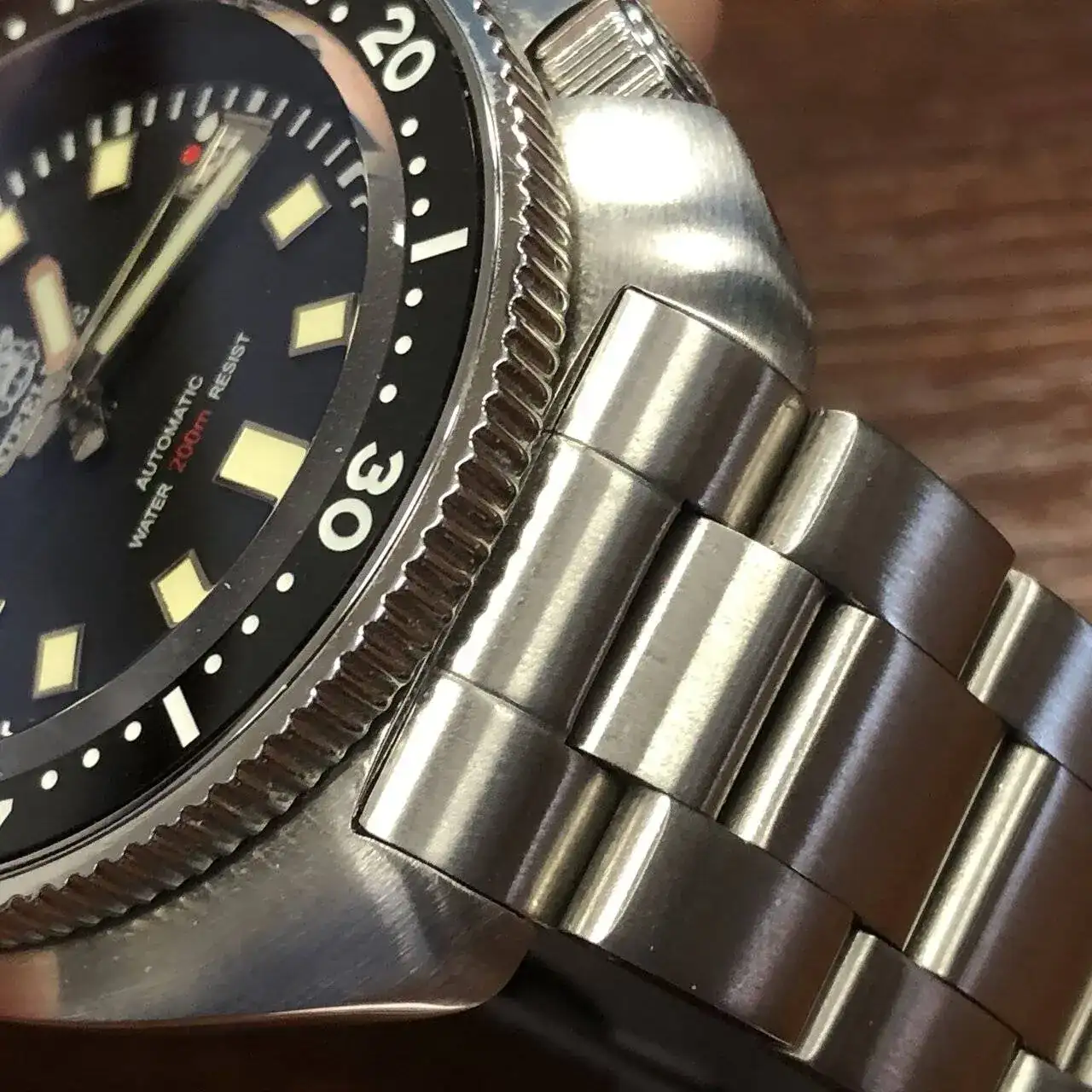 Los eslabones son demasiado anchos (yo lo llevo con tres eslabones a un lado y cinco al otro), por lo que es difícil que ajusten bien en la muñeca. Al menos esto parece que es algo sobre lo que por fin se han dado cuenta en Seiko: sus nuevos brazaletes con diseño similar ya tienen eslabones más estrechos.