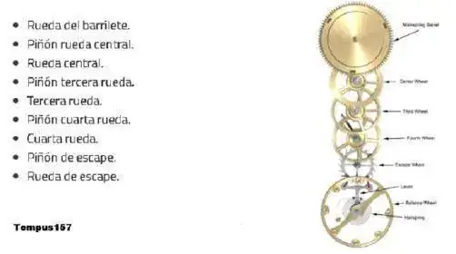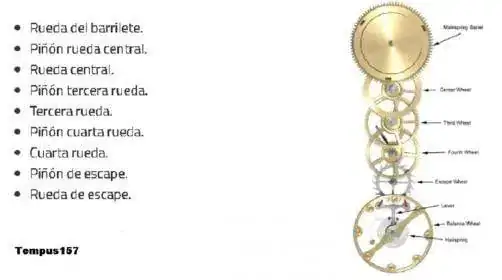 Tren de rodaje : Conjunto de ruedas y piñones engranados que transmiten la fuerza de la cuerda desde el tambor al escape.