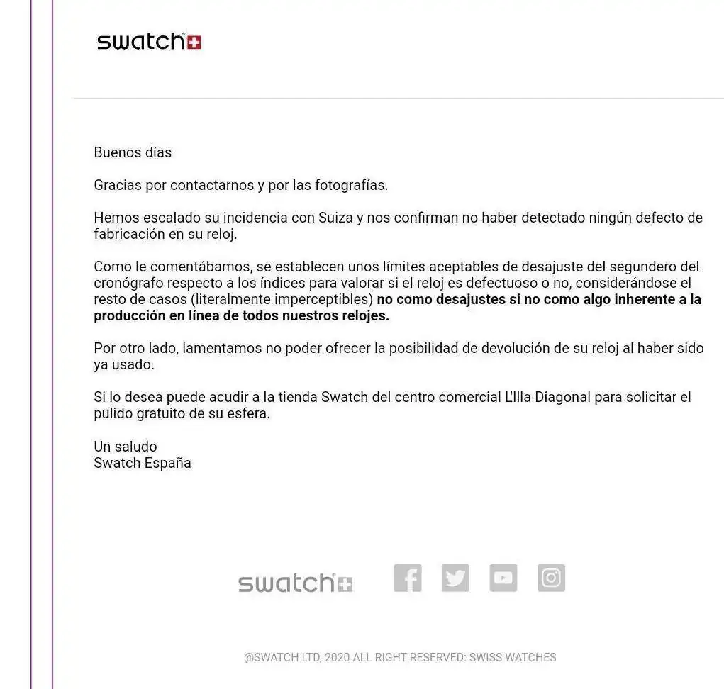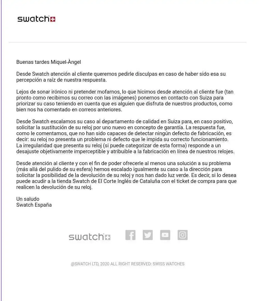 La respuesta de SWATCH una vez abierto el caso es que admiten la devolución del producto previa presentación del tiket de compra , quedando así exentos de toda responsabilidad .judicial y cerrando esa via , pero siguen manteniendo su criterio al no cambiar el reloj por otro igual , lo que parece más una actitud más personal de alguien que la política de una empresa suiza.