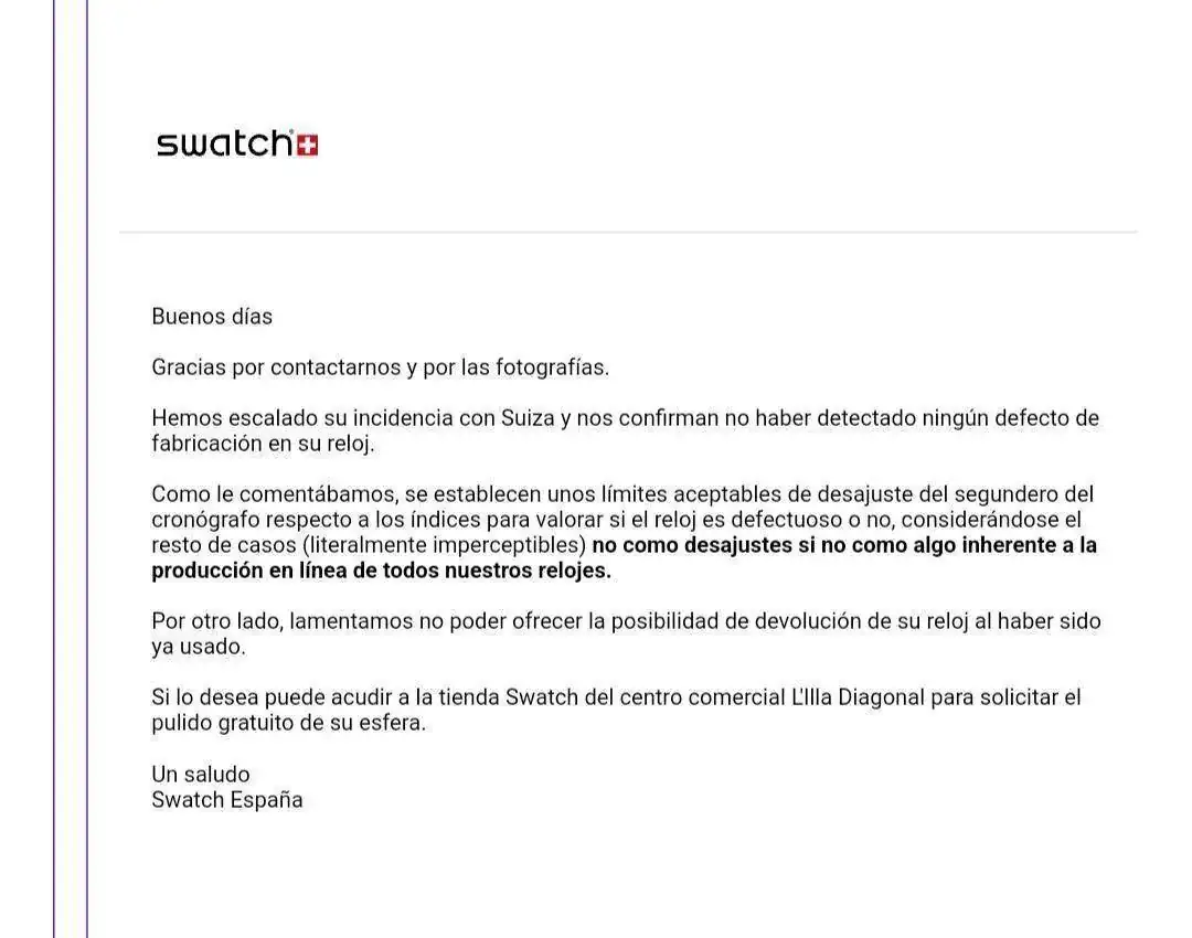 Hola amigo , entiendo y comparto gran parte de tu opinión, lo que ocurre es que son dos situaciones parecidas pero diferentes en forma y contenido , como he dicho anteriormente varias veces , en mi caso me invitaron a dejarlo para que el SAT lo cambiara . Se envió al SAT a Madrid el cuál lo admite ( podrían haberlo rechazado como a ti presencialmente o en una semana y asunto cerrado) después de estas 4 semanas se me dice que entra dentro de los parámetros de calidad, al recibir la respuesta y el reloj observo en el mismo que ha sido dañado el plexiglás , que para vuestra información , está fabricado por un material no apto para usar el típico poliwatch , el cual poseo y utilizo en mis vintages , poliwatch es un producto excelente para pulir plexis convencionales pero que dañaria el plexi fabricado para esta serie , no es compatible, que lo sepáis.