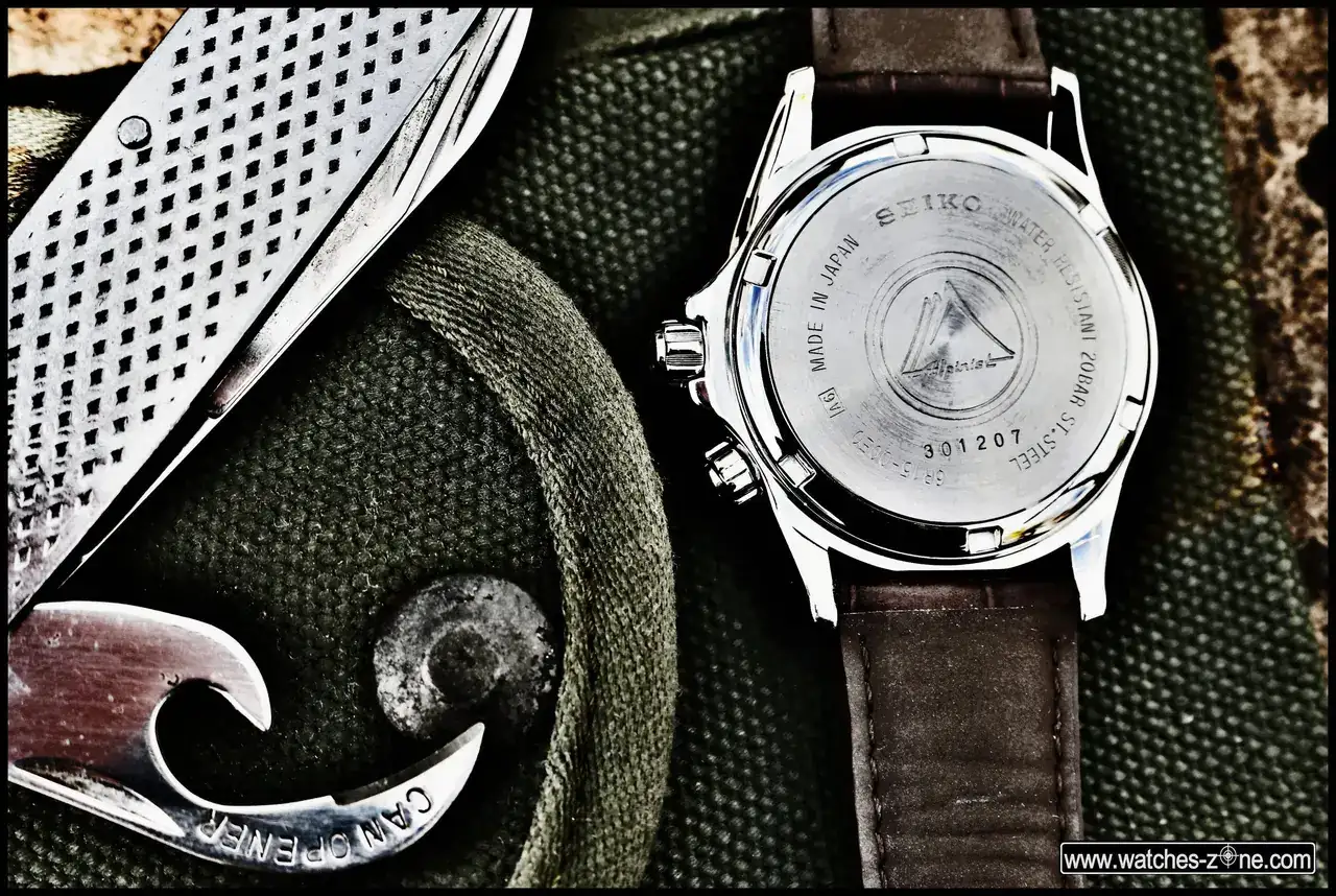 El fondo del Seiko Alpinist está conformado por una robusta tapa de acero gruesa y de muy buena factura. Presenta dos terminaciones, una mate en la base y otra cepillada en los extremos a la altura de las muescas para las garras de la llave extractora.