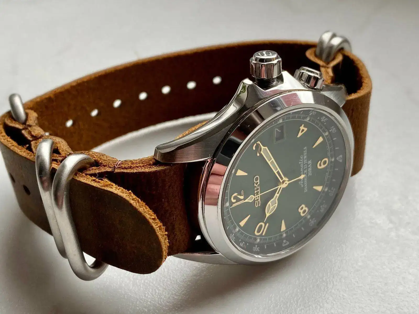 La correa con la que salen a la venta la mayoría de los Alpinist es una marrón de piel de cocodrilo. Si bien no es de mala calidad, se cuartea con el uso.