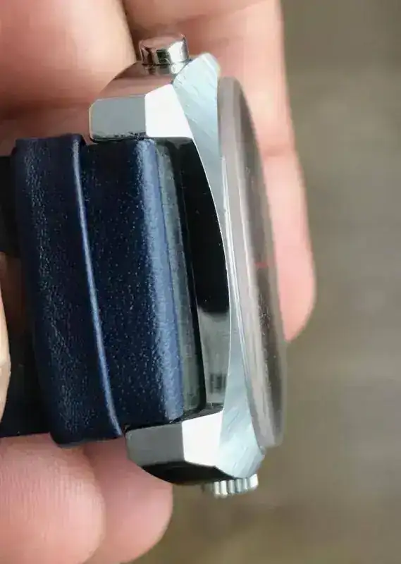 Es un reloj difícil de fotografiar bien porque la caja esta pulida en rayos de sol por arriba, a espejo por los lados y en los biselados de la caja es cepillada. También la esfera es difícil, porque es un azul oscuro pero tiene un tornasolado que con la luz varia de color entre azul oscuro y claro.
