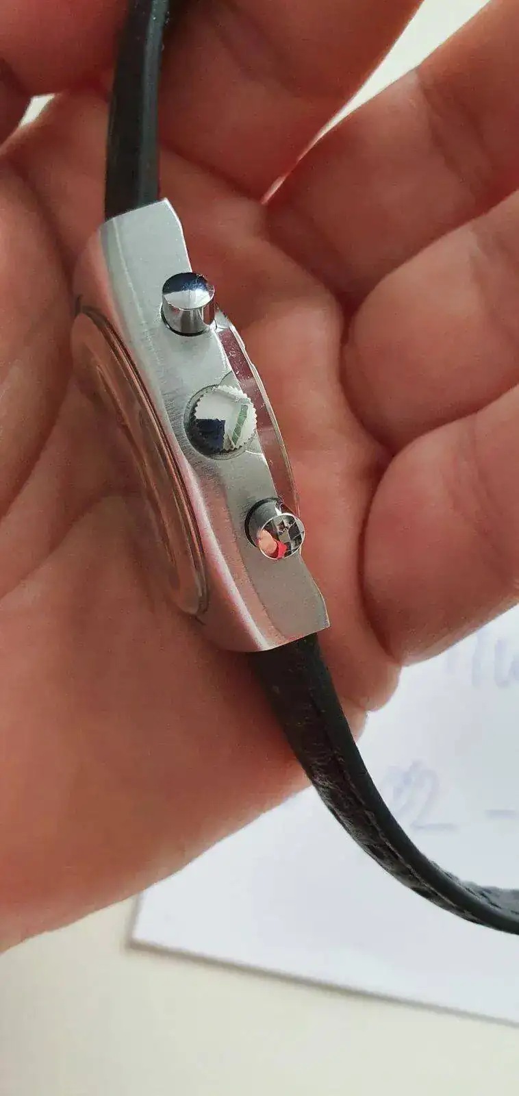 - Corona y pulsadores de cronógrafo originales del modelo en acero inoxidable en perfecto estado, triple cronógrafo funcionando a la perfección.