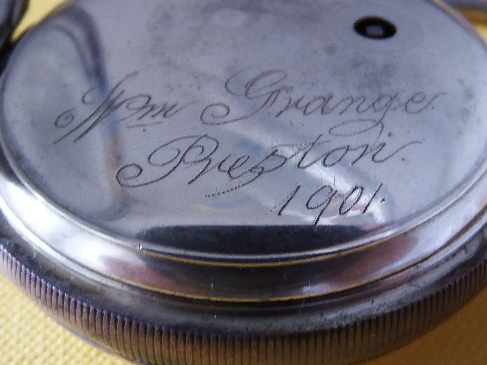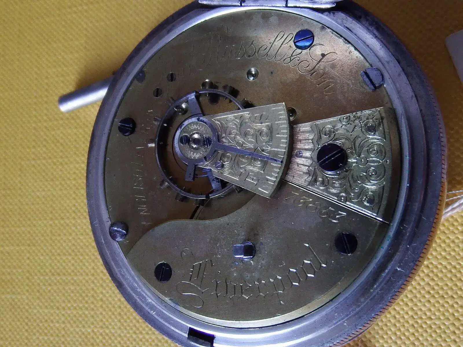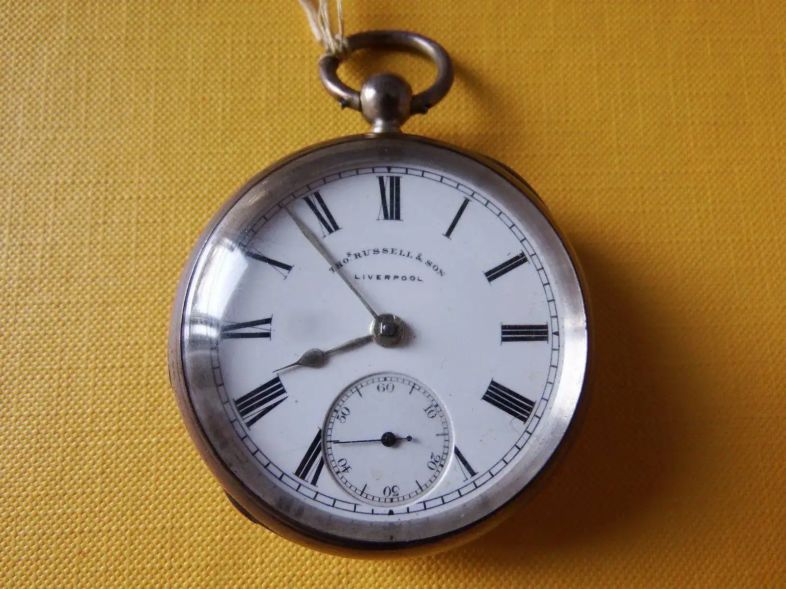 Reloj de bolsillo, Fabricado por THOS.RUSSELL & SON (Liverpool).Caja y guardapolvo en plata, con marcas de Chester del año 1899, caja num 5996. Inscripción en tapa trasera Grange, Preston. 1901