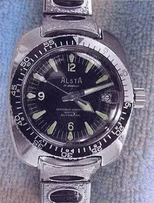 El reloj de Richard Dreyfuss, en la famosa pelicula "Tiburón", Se trata de un poco conocido ALSTA, con un brazalete muy original, aunque bastante feo para mi gusto, demasiado setentero. Alsta-Nautoscaph.webp