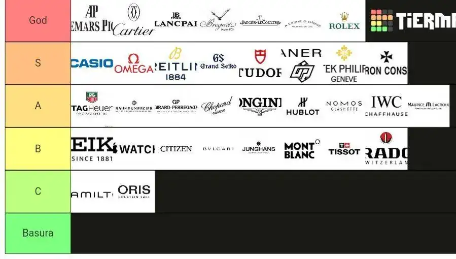 Pues estaba viendo una tier list de Watch Gringa y me ha dado por hacer una, la primera que hago de relojes. No soy muy dado a hacer tier lists porque siempre suelen ser polémicas al ser tan subjetivas. En este caso la he decidido hacerla en base a mis gustos y a la capacidad de las marcas de llevar la relojería a un punto cercano al arte. Que dos estén en el mismo nivel no quiere decir que las equipare, están ordenadas.