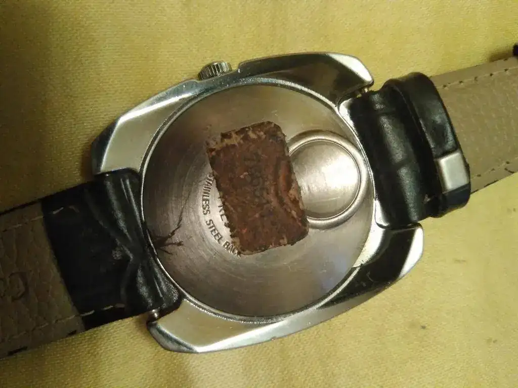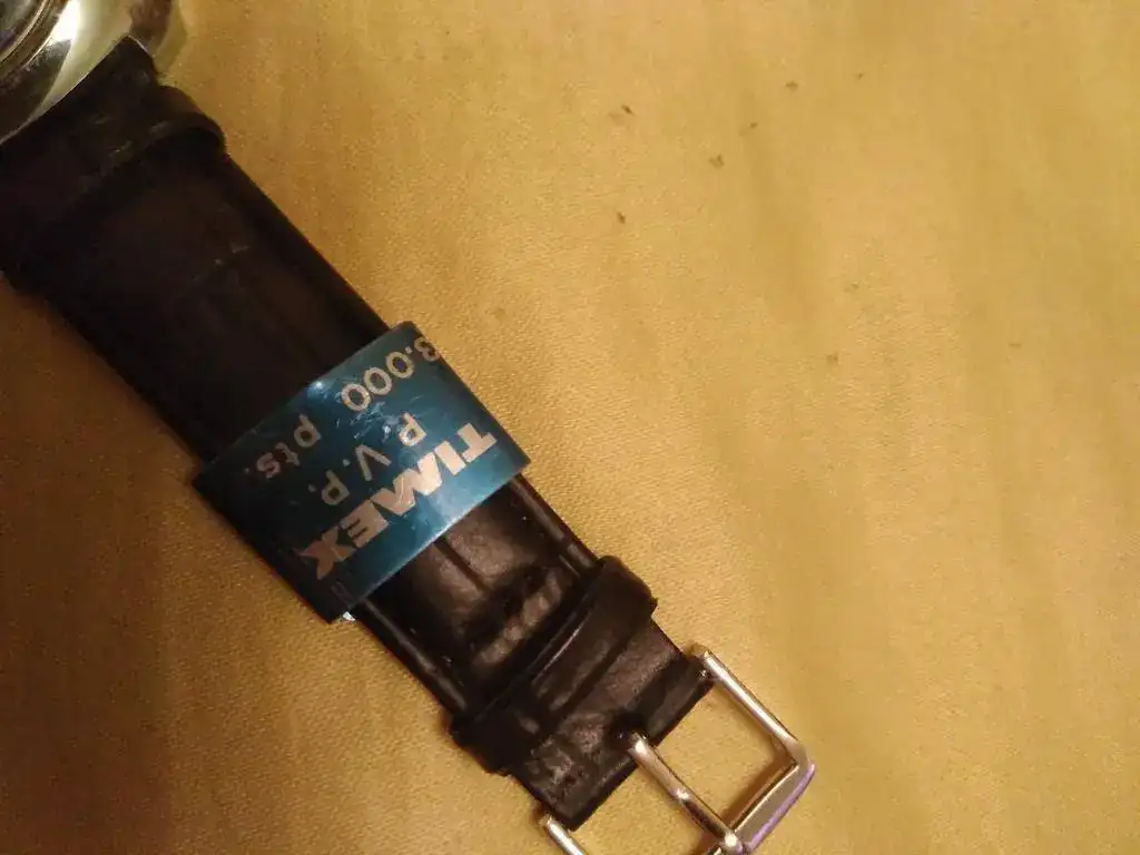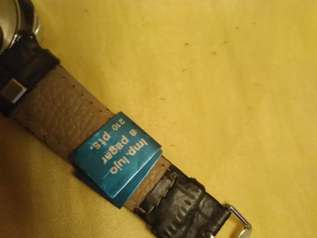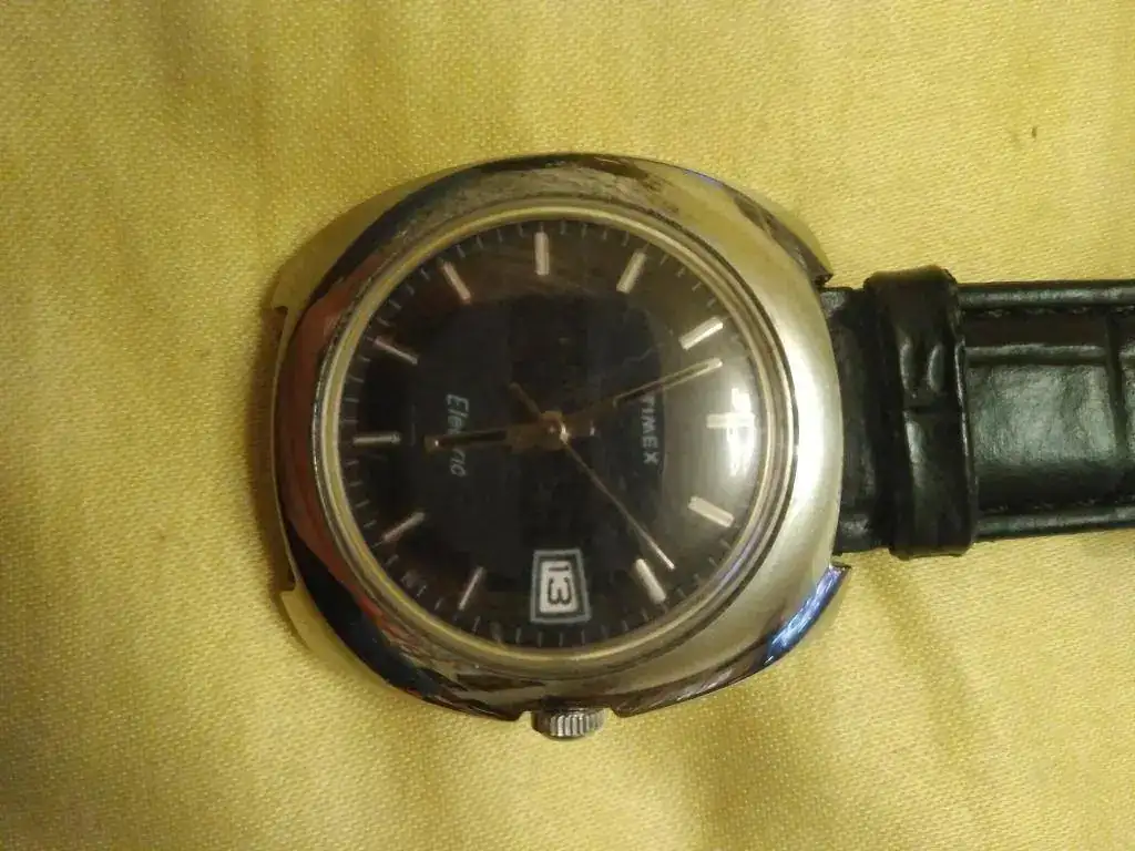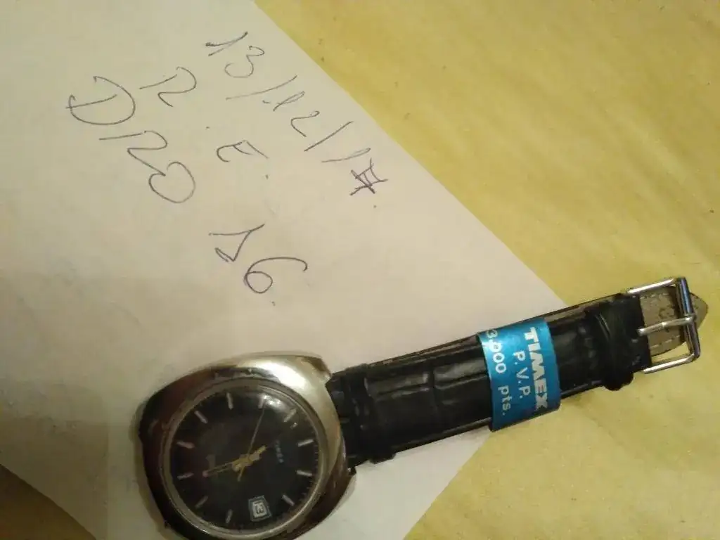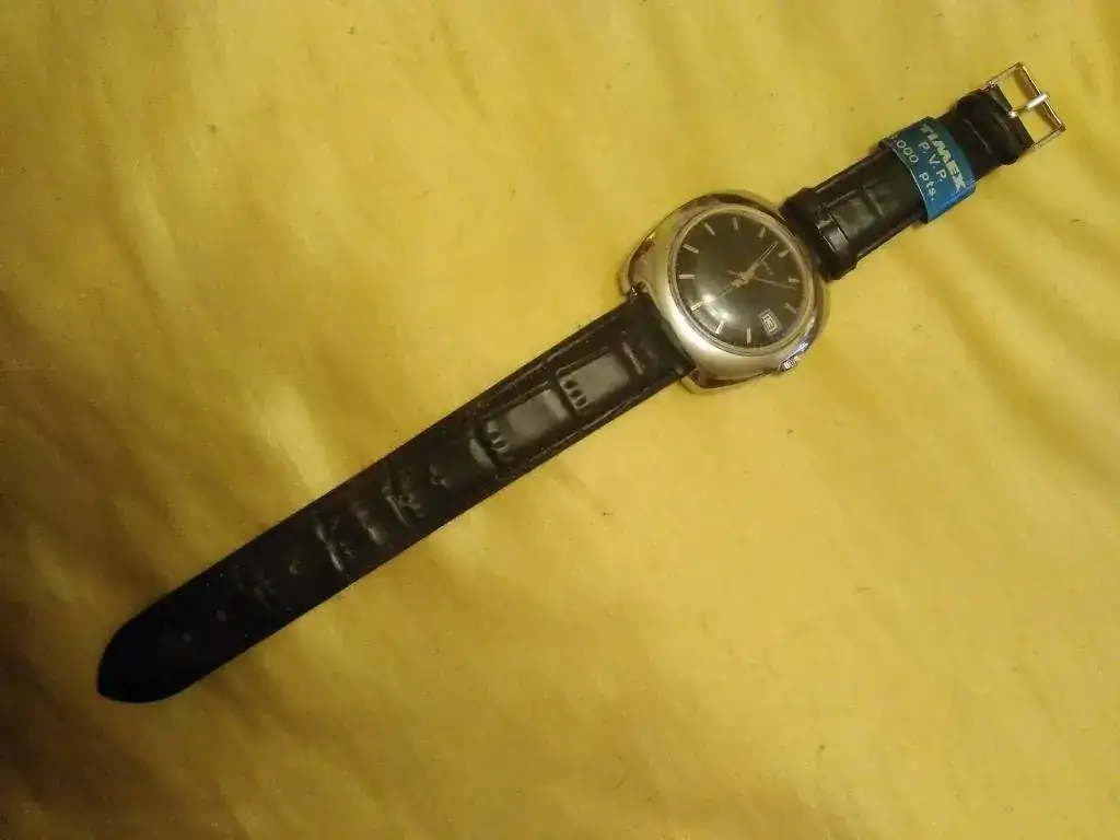 Ofrezco este reloj Timex Electric con día del mes, en estado NOS, con correa cambiada (pues la original estaba muy mal), pero con la chapita con el precio en pesetas y el impuesto a pagar en la correa nueva (ver fotos).