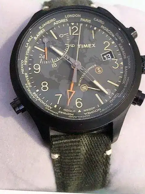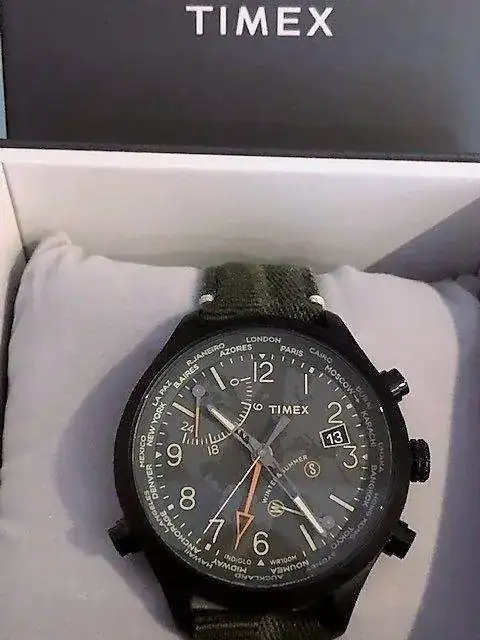 Pongo a la venta miTimex world timer, Intelligent Quartz, estética militar, con la esfera del mapamundi de fondo, funcion world timer, iluminacion indiglo en azul espectacular; 43mm full set, el reloj está en óptimas condiciones ya que lo he utilizado muy pocas veces porque mi vista ya no está para esferas demasiado recargadas.