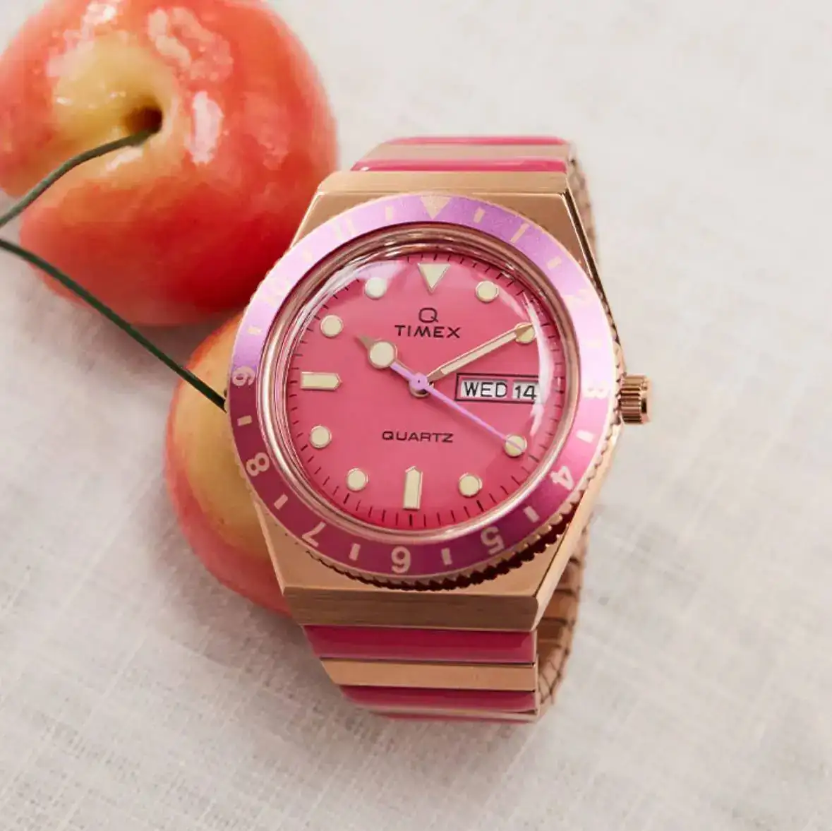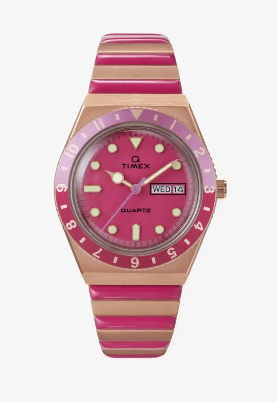 Dejando de lado mis idas por las ramas y entrando en materia, Timex también ha presentado unos modelos con los que pone, como dice la marca, el “Modo de Vacaciones On”. Concretamente son dos relojes ubicados en su gama Q, con la medida que tanto os gusta, 36mm, y en dos colores de dial muy de moda: rosa y morado, que contrastan con los tonos de sus cajas y armis.