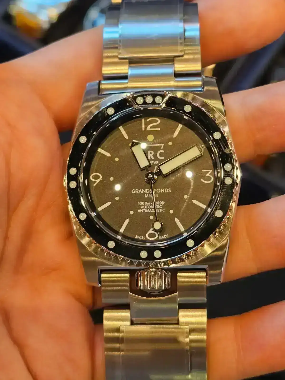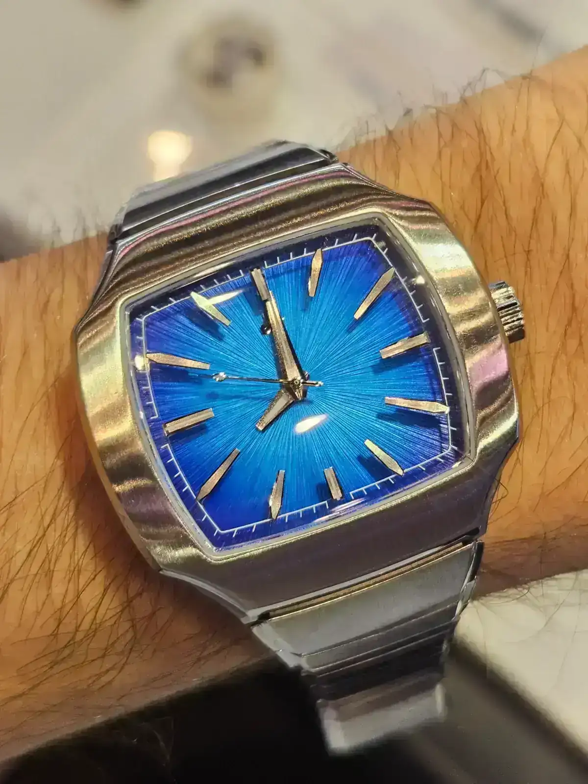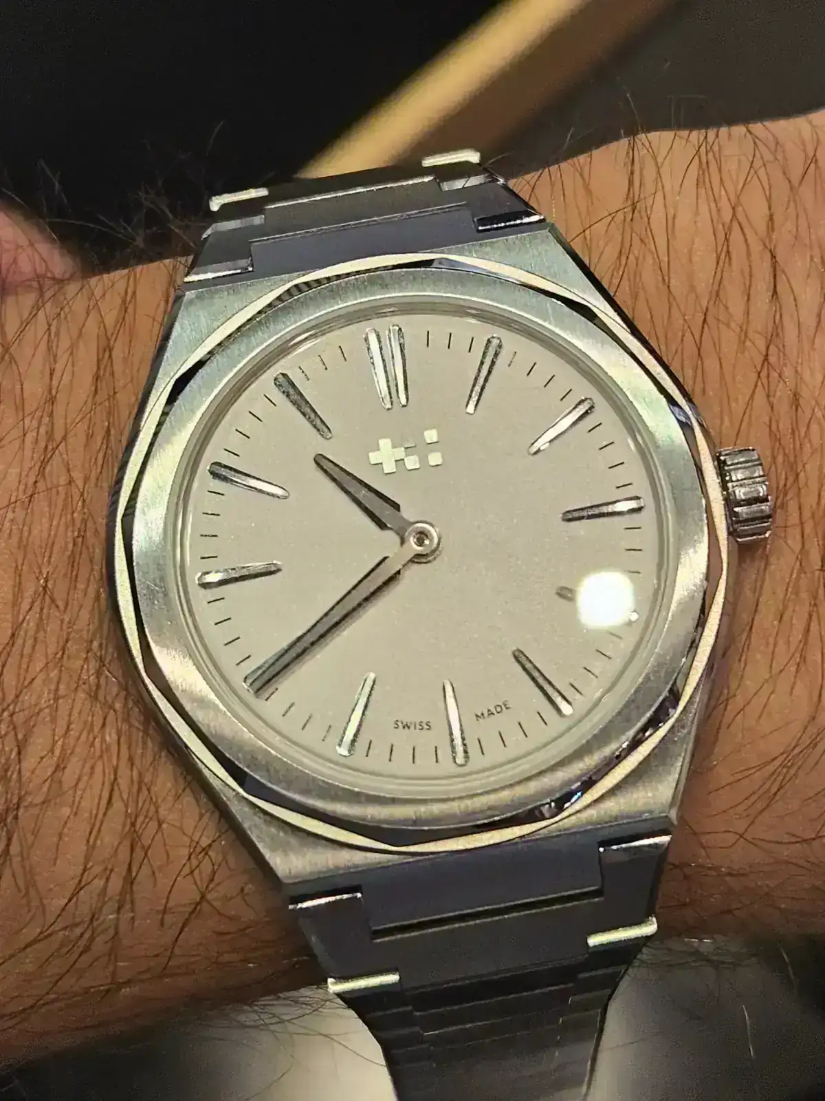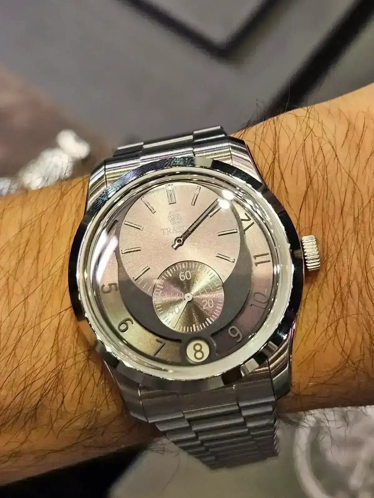 Y este, acojonante, ahora es mi brazalete integrado favorito. Mirad como queda en muñeca pequeña y el grosor. Me estuvo explicando como ha conseguido ese grosor tan bajo siendo un calibre de cuerda sellita y es tremendo como han tenido que ir jugando con la altura de indices, agujas etc y hacer todo super ajustado