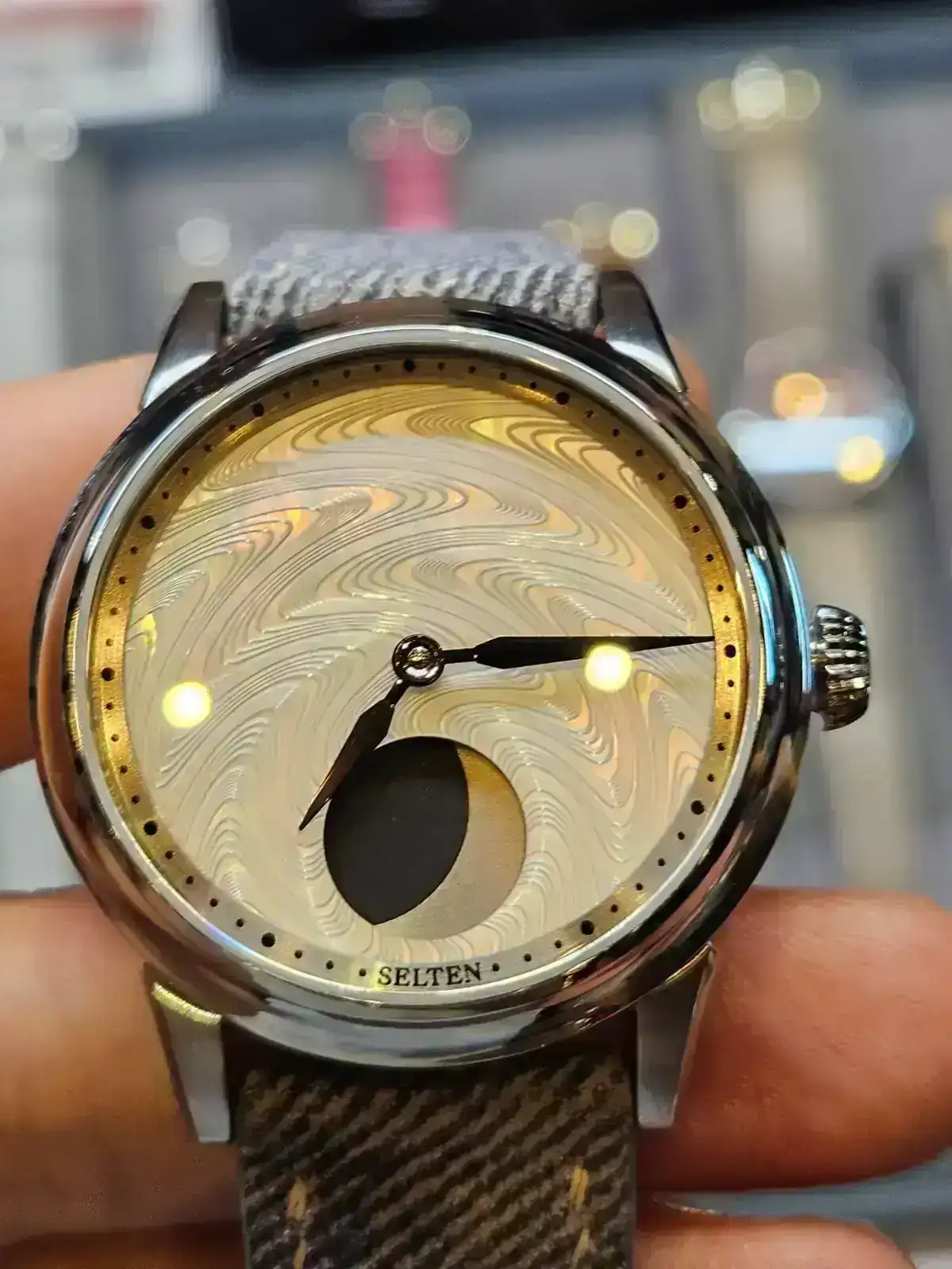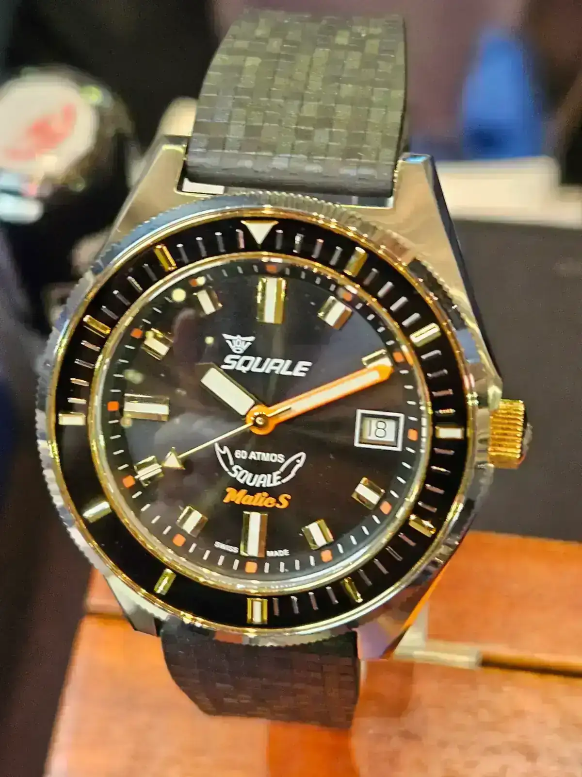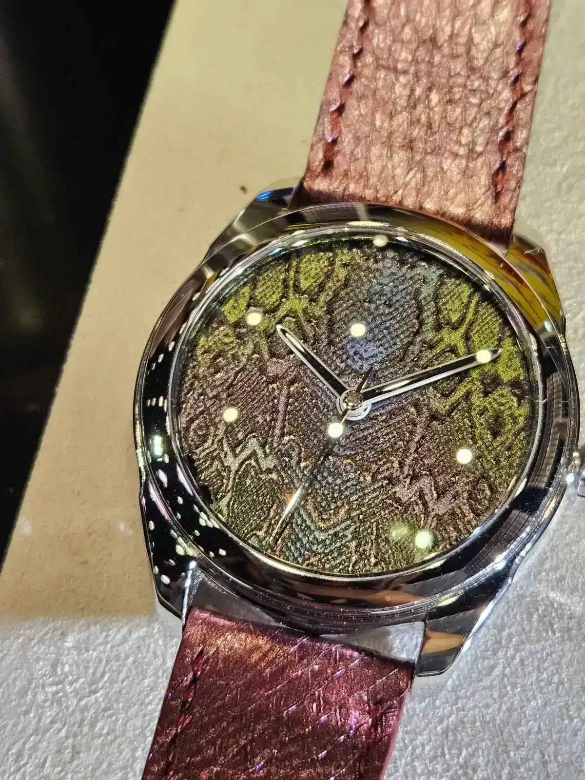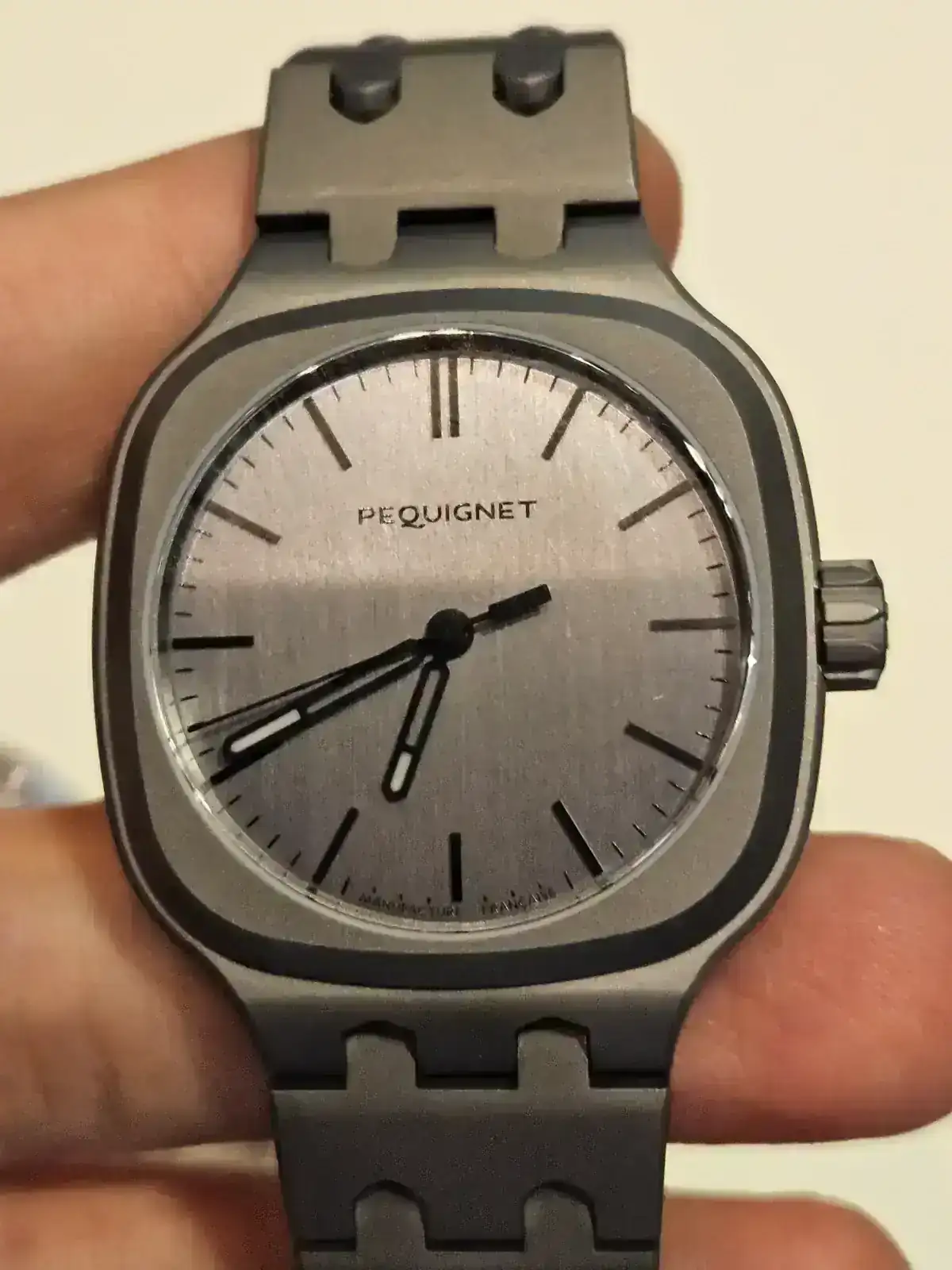Y este, acojonante, ahora es mi brazalete integrado favorito. Mirad como queda en muñeca pequeña y el grosor. Me estuvo explicando como ha conseguido ese grosor tan bajo siendo un calibre de cuerda sellita y es tremendo como han tenido que ir jugando con la altura de indices, agujas etc y hacer todo super ajustado