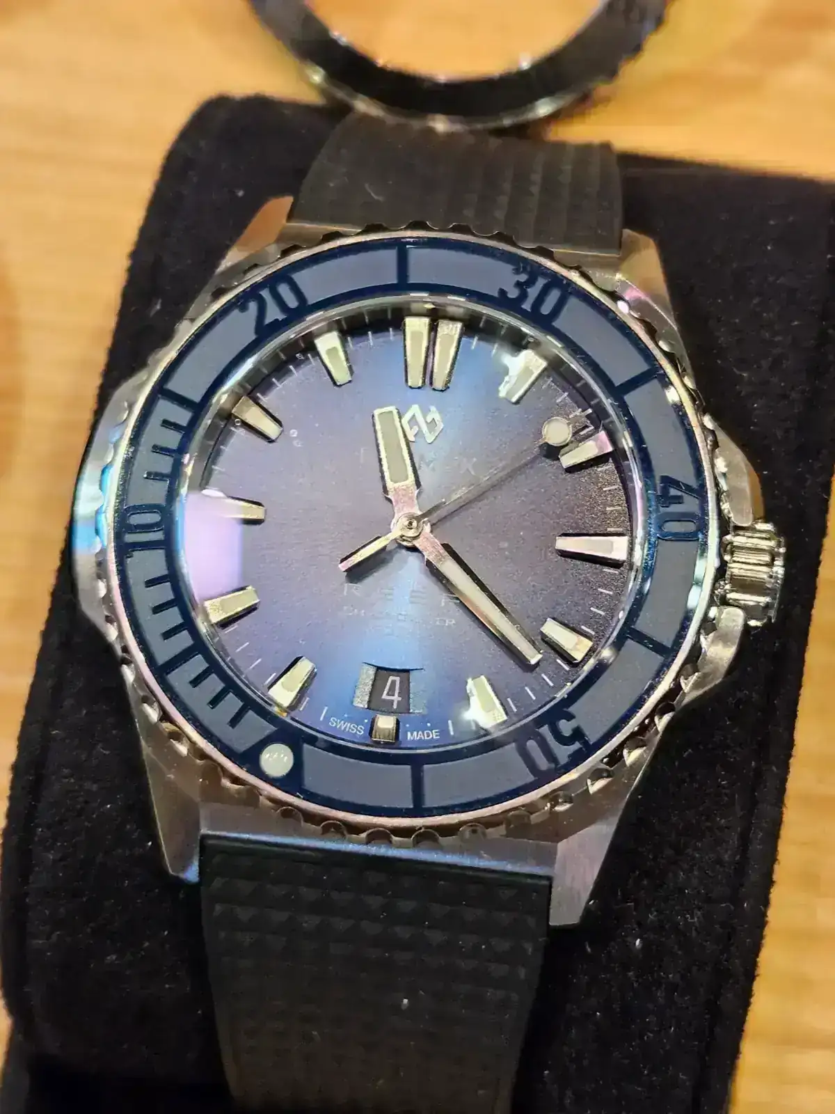 Y este es un diver hecho para un canal de youtube que es Mad Watch Collector y la gracia es que los índices cambian de color cada hora, de blanco a rojo, se vale de un calibre GMT para ello.