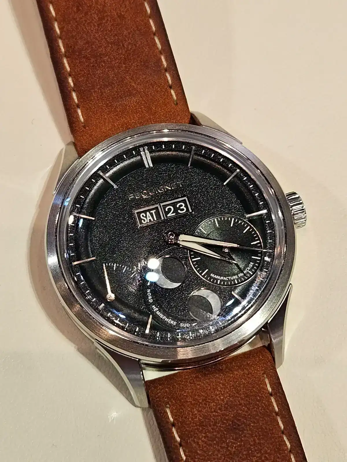 Pequignet, un señor encantador e ilusionado por la relojeria francesa. Gran calidad, muy bonitos. El movimiento es in house hecho en Francia y el resto de partes, principalmente Alemania y Suiza, me confesó que como es evidente algo viene de China pero nada del movimiento