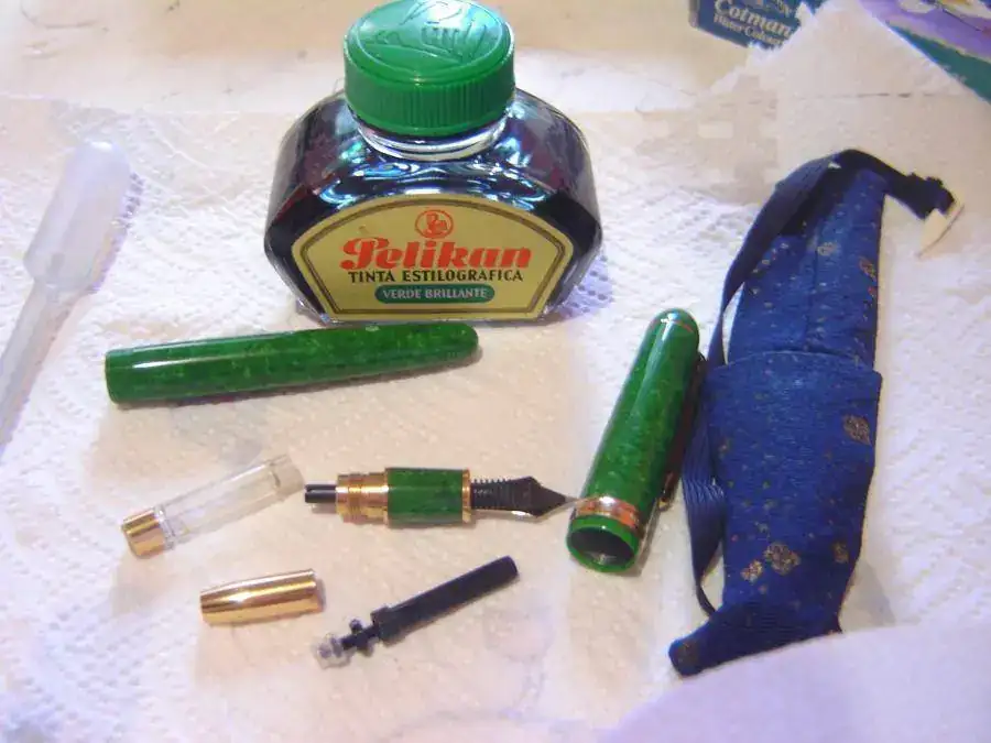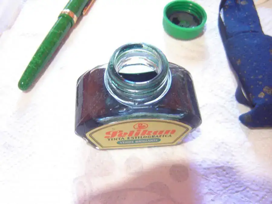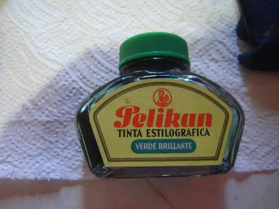, asi que como habia mucha gente esperé a que me mostrara las plumas antiguas, pero en ese momento llego un señor buscando tinta verde, asi que yo pense: Bueno, es cuestion de ver que tintas tiene; cuando el distribuidor menciono sus tinteros waterman no me sorprendio, pues ya estaba tan desanimado de la tinta que queria buscar, pero en un momento el que nos atendio menciono una tinta pelikan verde brillante que tenia guardada desde hace años, y eso llamo mi atención, asi que observe el tintero, y si me parecio algo viejo, y cuando se la ofrecio al señor, le comento que se la dejaba barata porque estaba cortada; lo que yo pense que no seria posible. De tal manera que la probaron en un papel, pero como era de baja calidad y depositaron una gota de tinta, pues como que se veia extraña, de tal manera que el cliente se desanimo, asi que dije, pues yo si me llevo, pues no parecia cortada, y el argumento era que si estaba cortada no fluiria bien en la pluma y posiblemente no se depositaria en el papel. Pero bueno, yo queria ese tintero