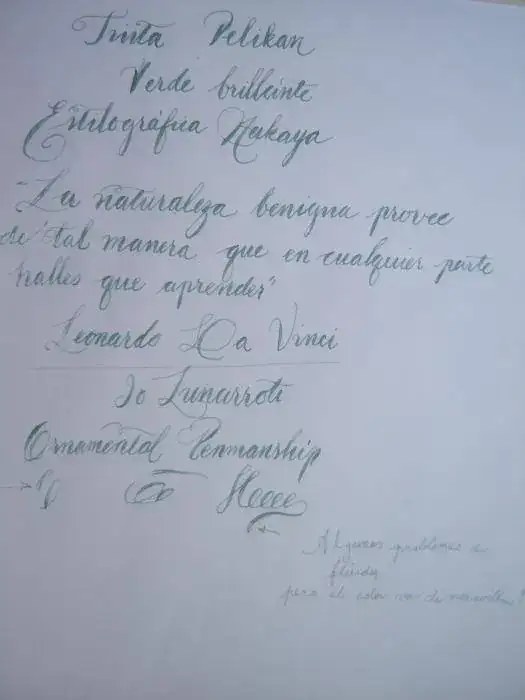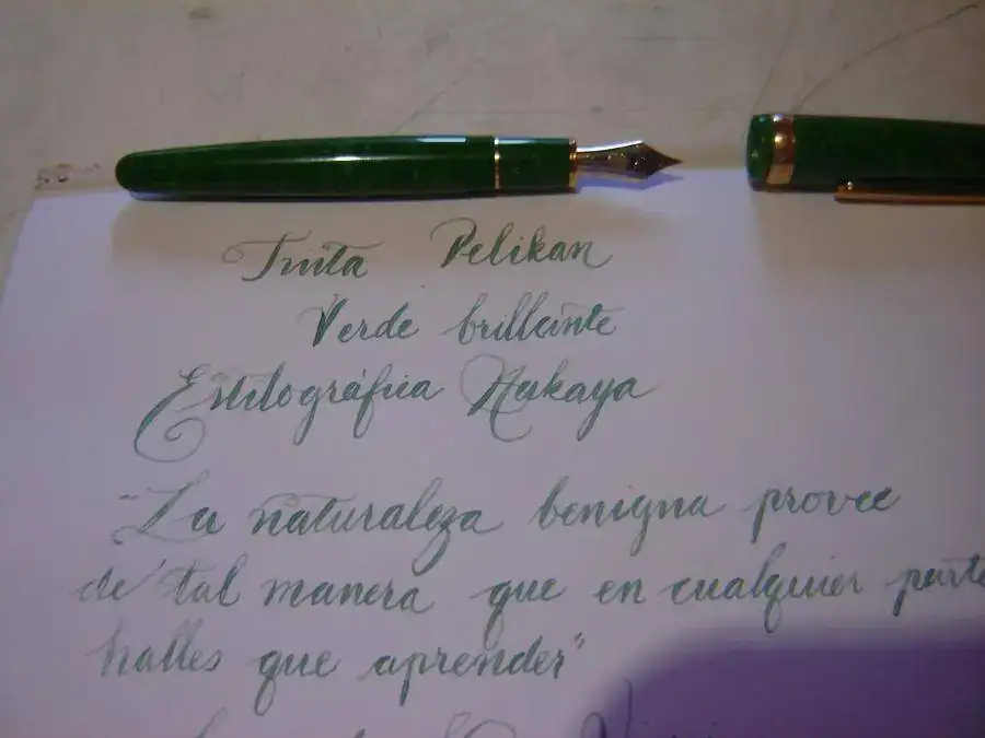 asi que lo tome y le dije que lo queria, En fin, probe las plumas y no habia ninguna flexible, y en cuanto llegue a mi casa, rapidamente probe la tinta y la cargue en una pluma de punto rigido y su desempeño fue excelente, el color me agrado, de brillante no tiene nada, pero ahora es un verde seco