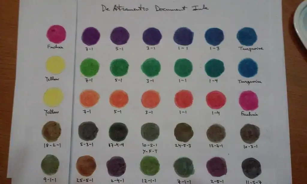 En las dos últimas líneas he mezclado los tres colores en las proporciones indicadas de Yellow-Fuchsia-Turquoise.