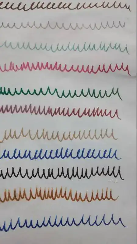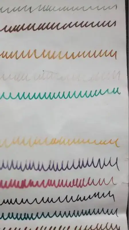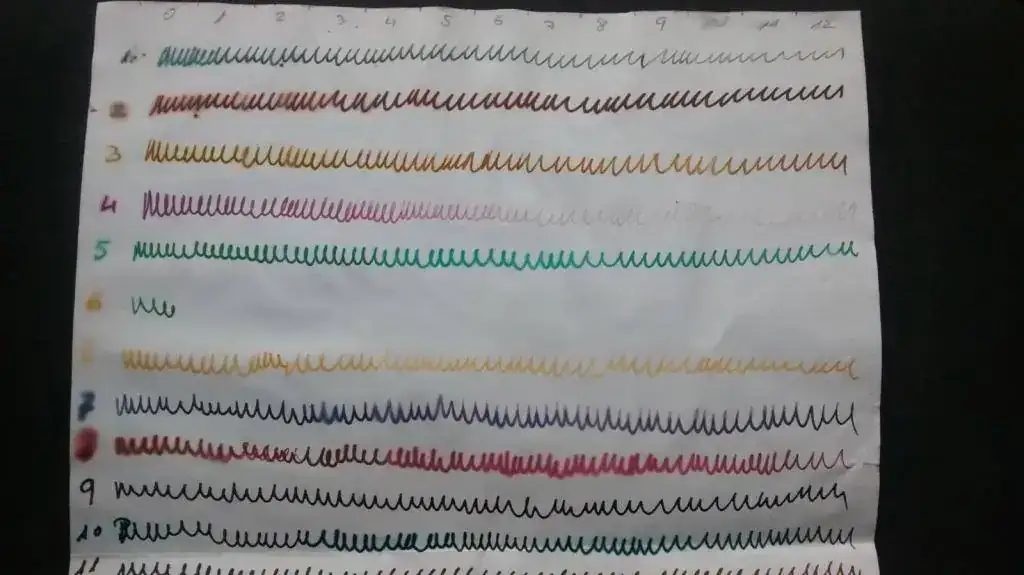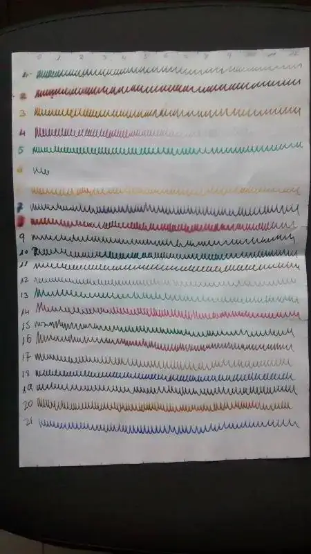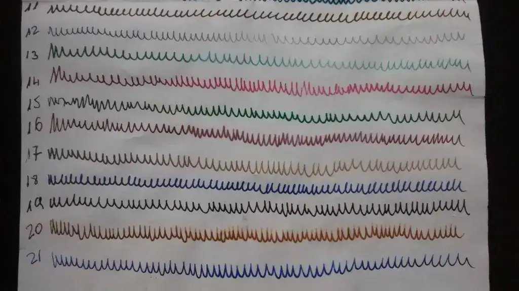 Muestras: 21 de diferentes marcas y colores. La línea se ha trazado con palillero en casi todas las muestras. Se indica la estilográfica en caso de que no haya sido palillero.