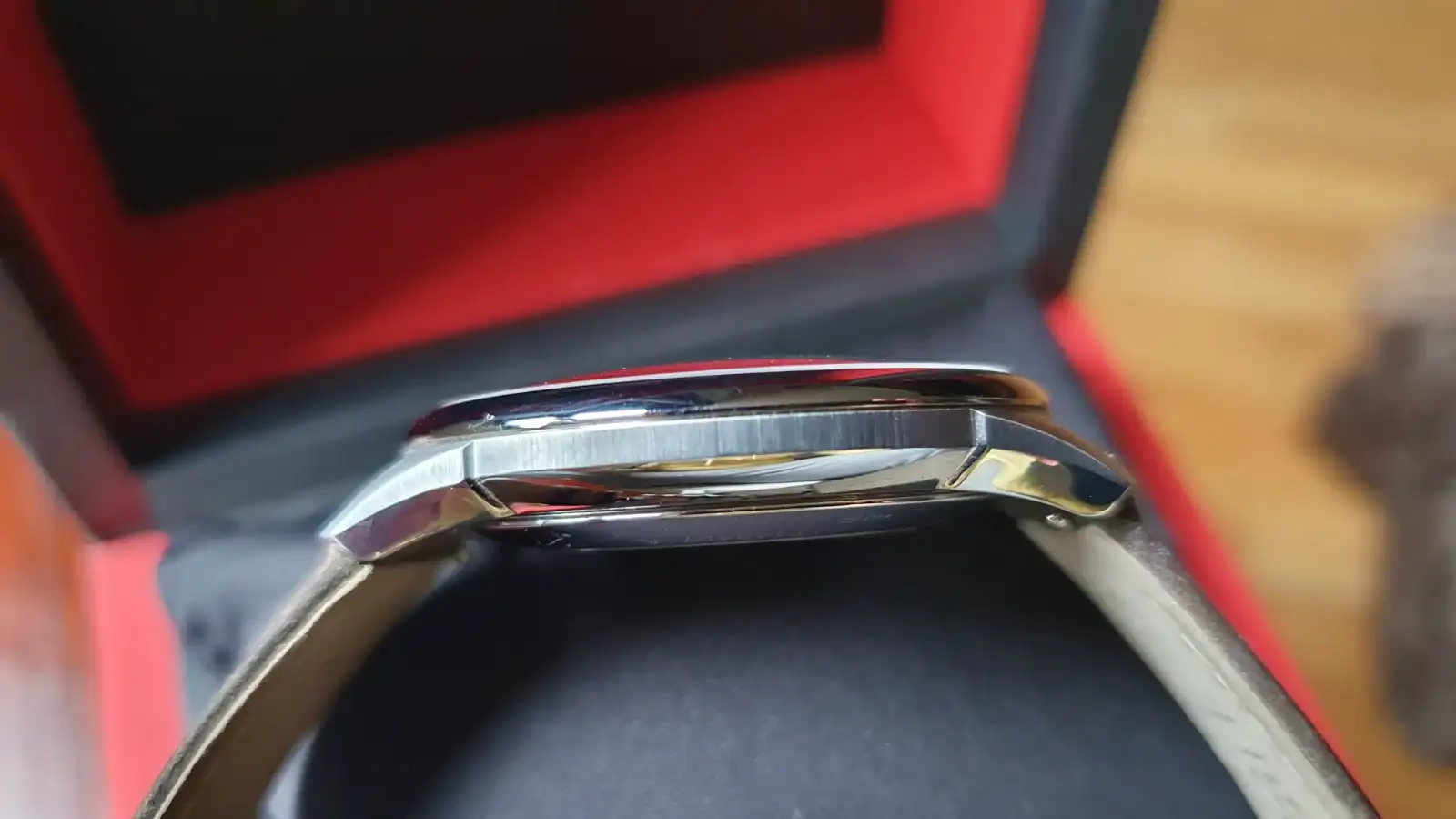 La esfera es de color champagne, que varía en función de la luz hacia un tono más dorado y en otras ocasiones hacia el plateado. Preciosa.