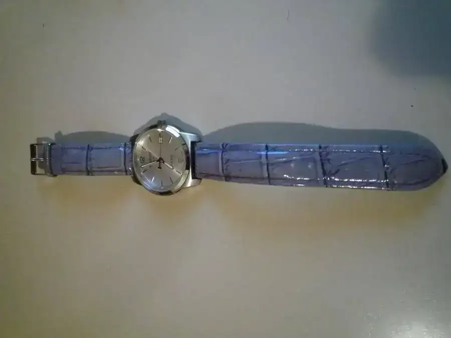 Va con correa de piel grana de cocodrilo, pero seguramente se envie tambien el armis original (he de buscarlo, pero lo encontraré), pero va sin la caja original ni documentación, "aunque irá en una buena caja."