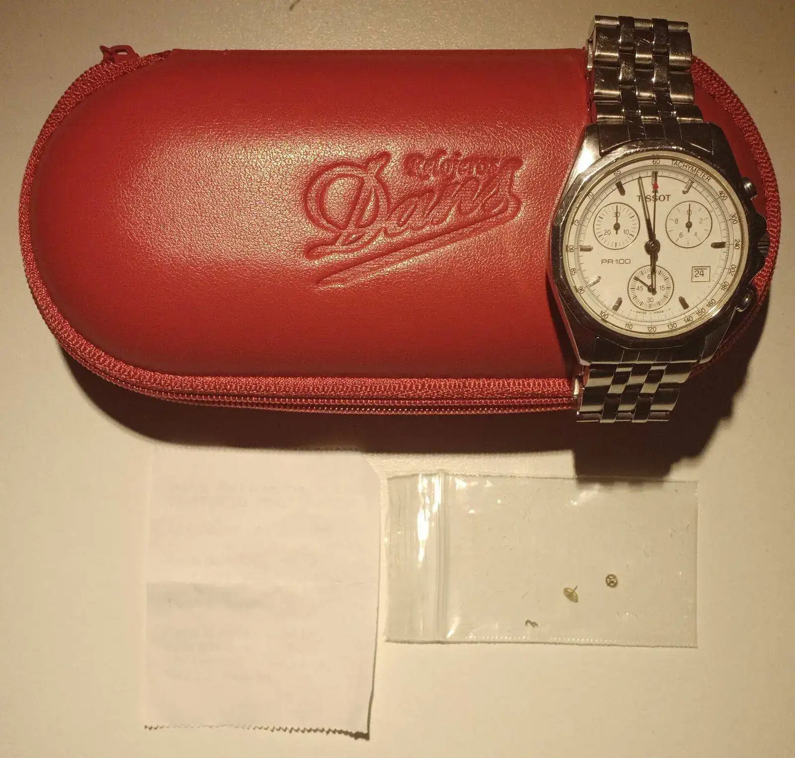 Tengo un Tissot PR100 del año 95, movimiento P372/472-1. Es un regalo de mi abuela, así que es más el valorsentimental que otra cosa. El tema es que llevaba años estropeado en un cajón allí en Madrid. Y este verano me lo traje a ver si podía arreglarlo donde vivo. Total, que acabó en el servicio técnico oficial en Bruselas, y me dijeron en el informe: