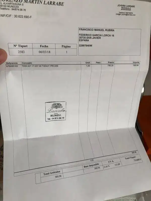 Vendo Tissot PRC 200 AUTOMATICO con tan solo 3 meses ,,puesto muy pocas veces y esta impoluto.comprado en joyería Larrabe el 6-03.2108. fue un regalo de mi madre.