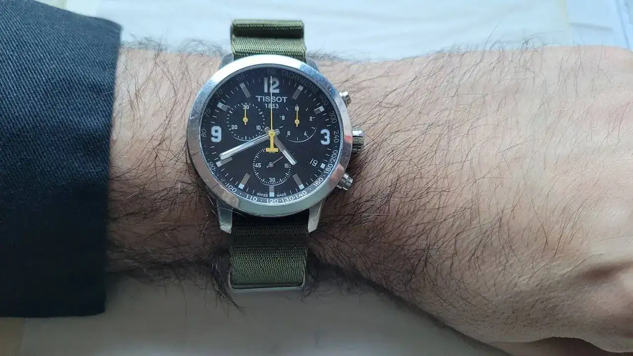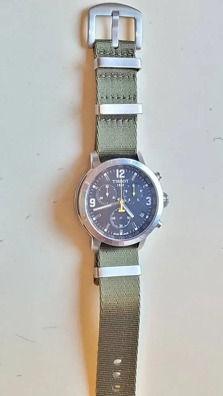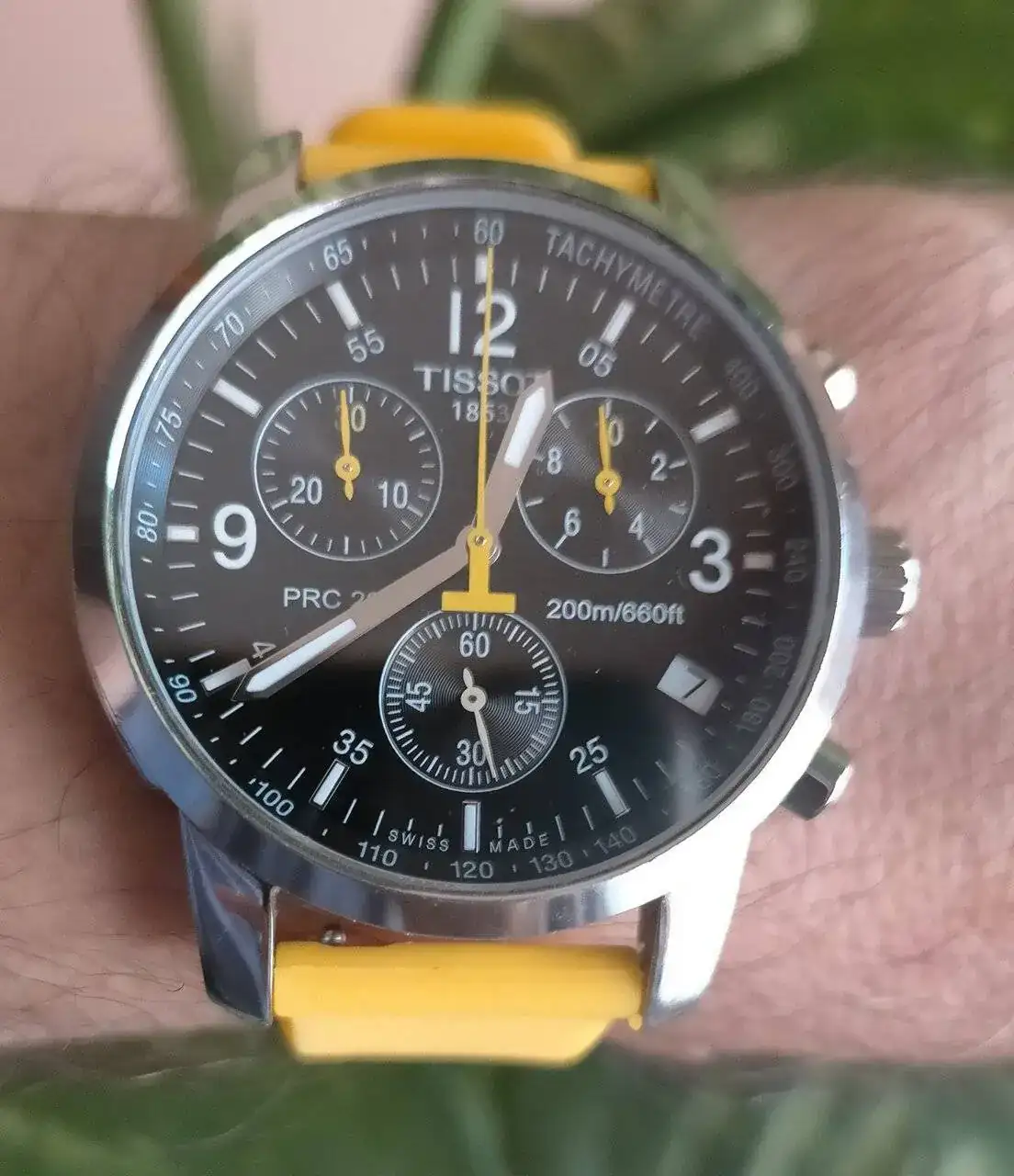 Este es mi Prc con un caucho veraniego. Normalmente lleva el cierre original deployante con cuero negro. Estuve tentado por una nato negra y amarilla, las he visto en fotos y le quedan bien estéticamente (en mi opinión, que es eso, mi opinión, es un color algo más adecuado que el de