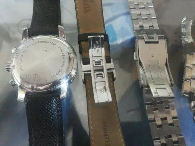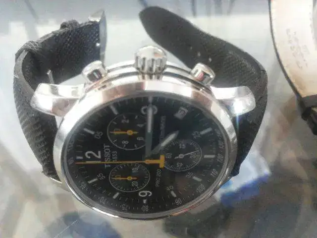 TISSOT prc 200 cuarzo ref. t17152652 Cronografo, corona firmada y tapa roscada, w.r. 200m. Con correa de piel, y cierre deployante firmado, las trabillas es la zona mas desgastada, yo diría que el resto esta bastante aceptable, correa tipo barco al 60% aprox de su uso, y armis muy poco usado, arañazos dificiles de ver (comprado en ebay, no se si es autentico, aunque esta muy nuevo y ya tiene sus años)