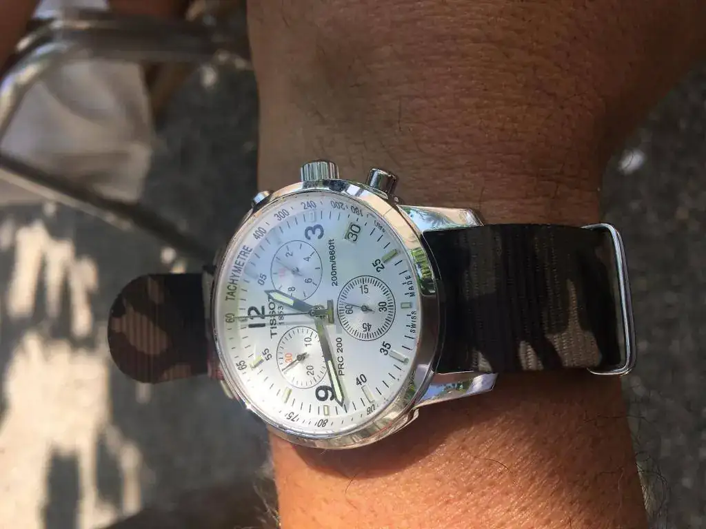 Amigos, he vestido a mi Tissot Prc200 con una correa Nato bien guerrera y queda mucho mejor que la clasicona de piel marrón que llevaba al comprarlo. Y eso gracias a vuestros comentarios. Muy satisfecho con el cambio. Gracias