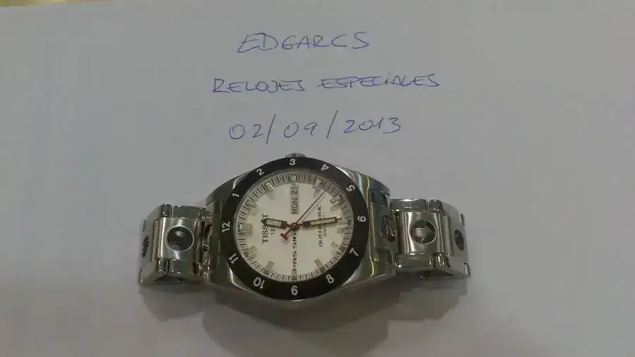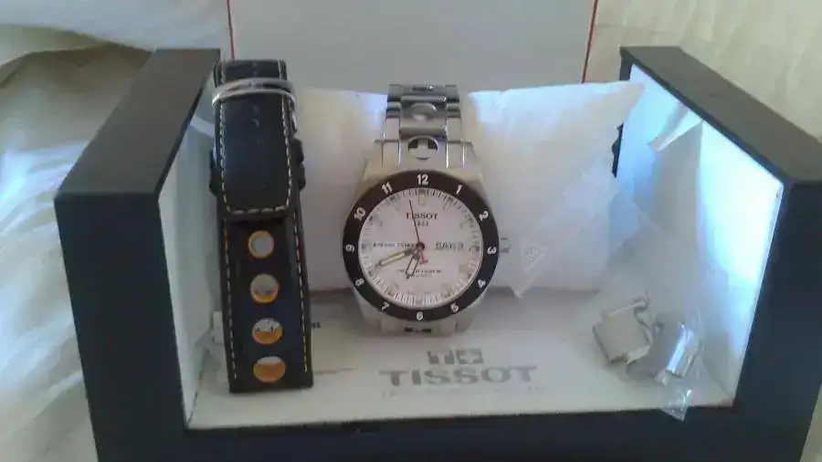 El reloj se entrega con el armys original y una correa de piel negra perforada tipo racing original con deployante original de Tissot en buen estado.