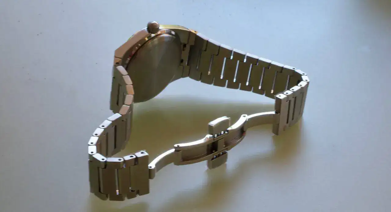 La concepción del reloj es idéntica a su hermano mayor, un diseño muy atractivo y que de alguna manera maximiza ese tamaño de 35 mm. La longitud se ha reducido a un compacto de 34,6 mm, aunque el primer eslabón añade un par de milímetros a cada lado, por lo que visualmente parece de 36 a 38 mm. El grosor total es de solo 9,6 mm. por lo que resulta muy cómodo, sin cabecear en absoluto.