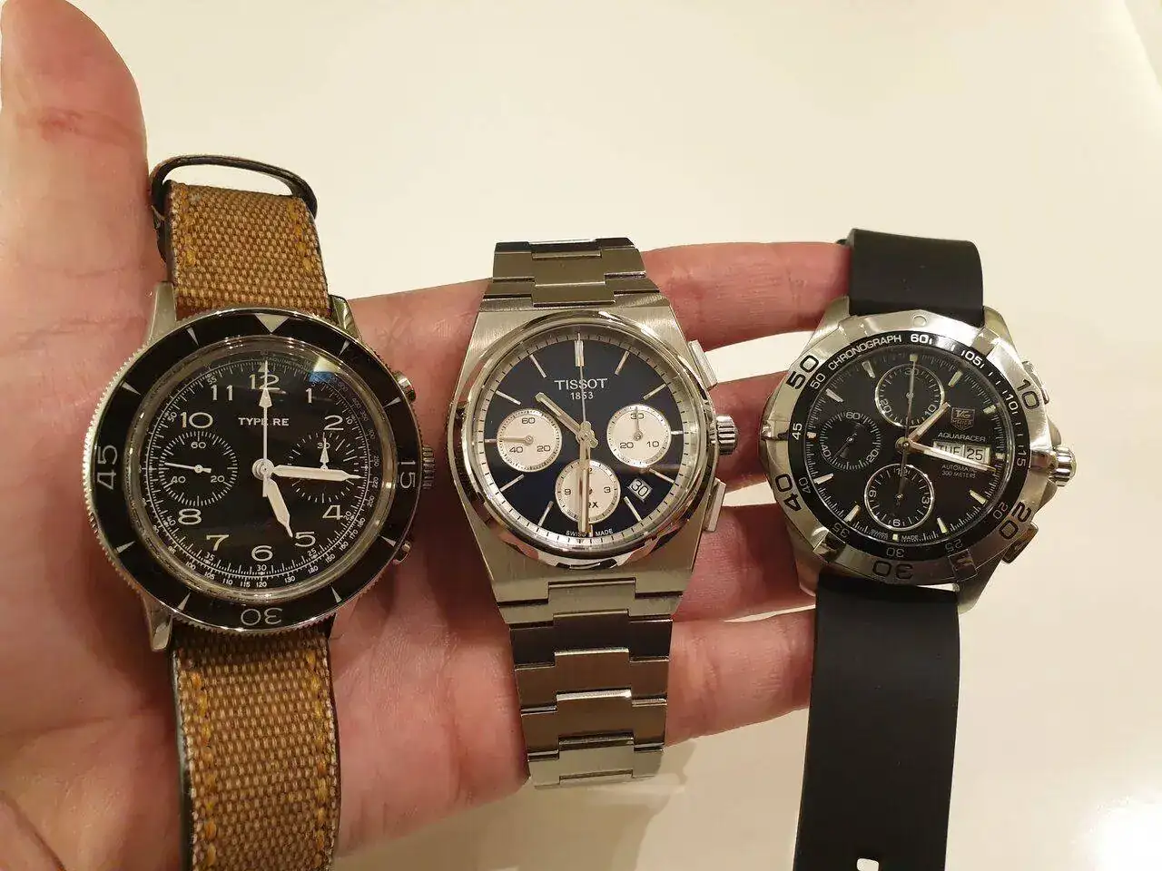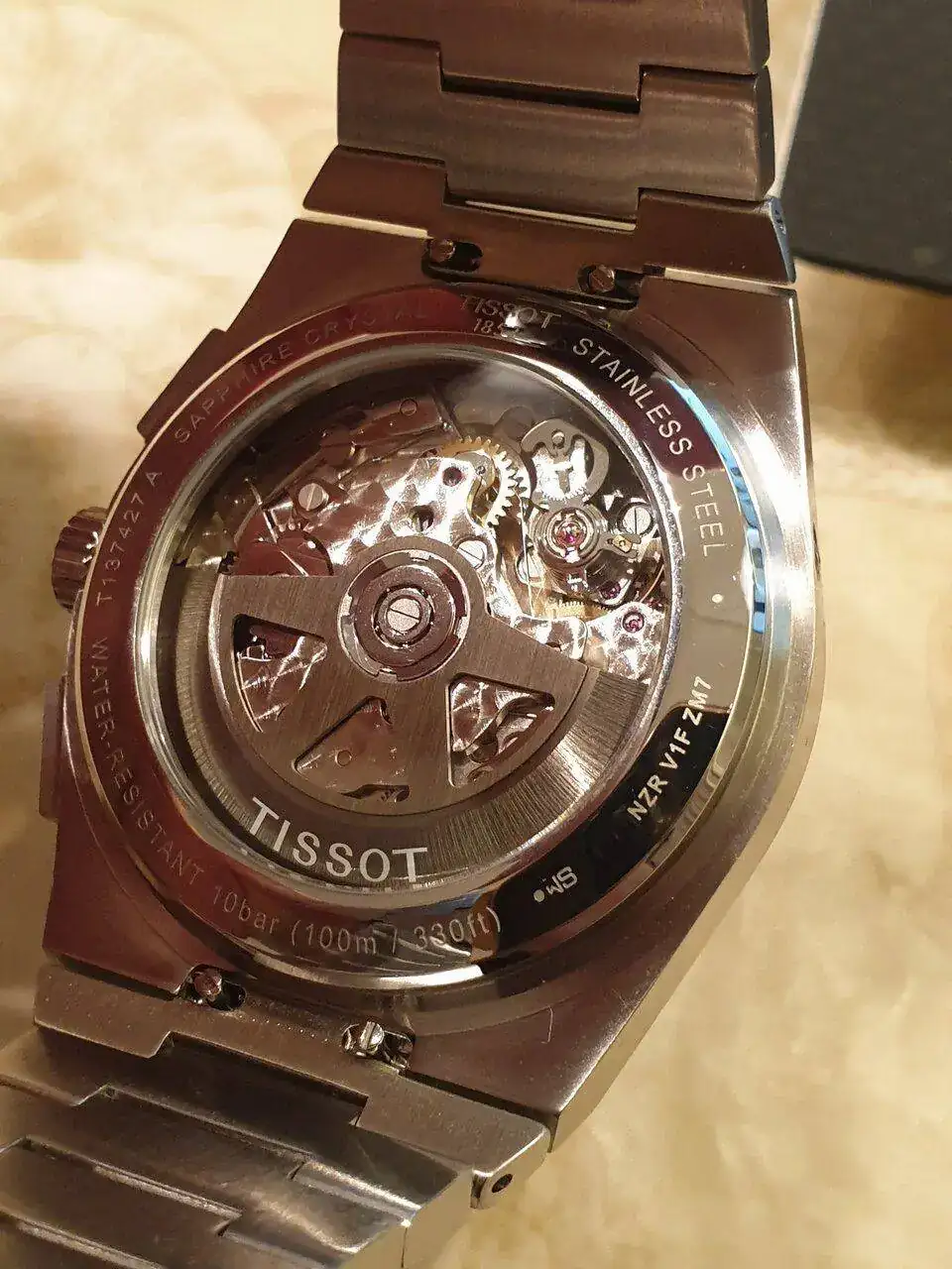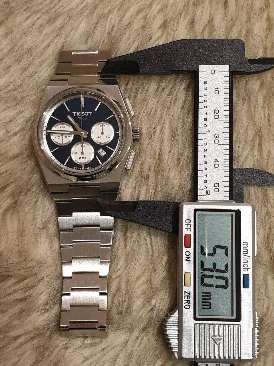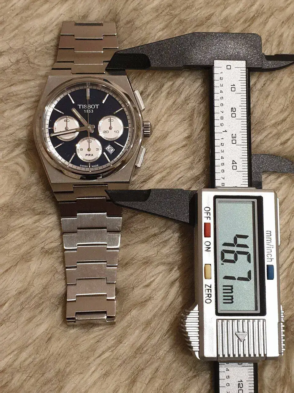 Sobre su tamaño, he de decir que es un reloj más bien tirando a "grandecito" y que se nota en la muñeca. Al fin y al cabo, es un cronógrafo mecánico. Es un reloj bastante grueso y con un lug to lug considerable. El último eslabón del armis (el que se integra en la caja) añade unos milímetros extra a la distancia entre asas (que pasa de aproximadamente 46,7 a 53 mm). Quizás pueda reducirse un poco esta distancia con el cambio de armis por caucho o correa de cuero, una vez Tissot los comercialice para este modelo. Yo iré a por el caucho para verano sin ninguna duda. Por cierto, es sumergible 100 metros, que está muy pero que muy bien para este tipo de reloj (50m o incluso 30m sería lo esperable).