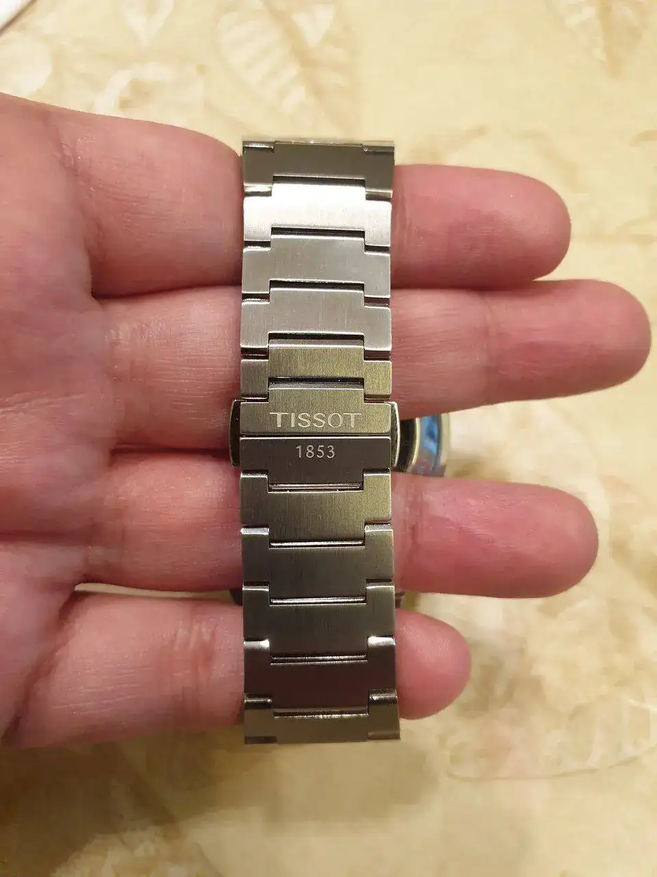 El armis es de muy buena calidad, muy cómodo y con posibilidad de quitar muchos eslabones. Esto es especialmente útil para personas como yo, con una muñeca pequeña. Cuenta también con un medio eslabón para un ajuste más fino (en la foto, es el eslabón que está sobre el eslabón firmado por Tissot). El cierre es de mariposa.