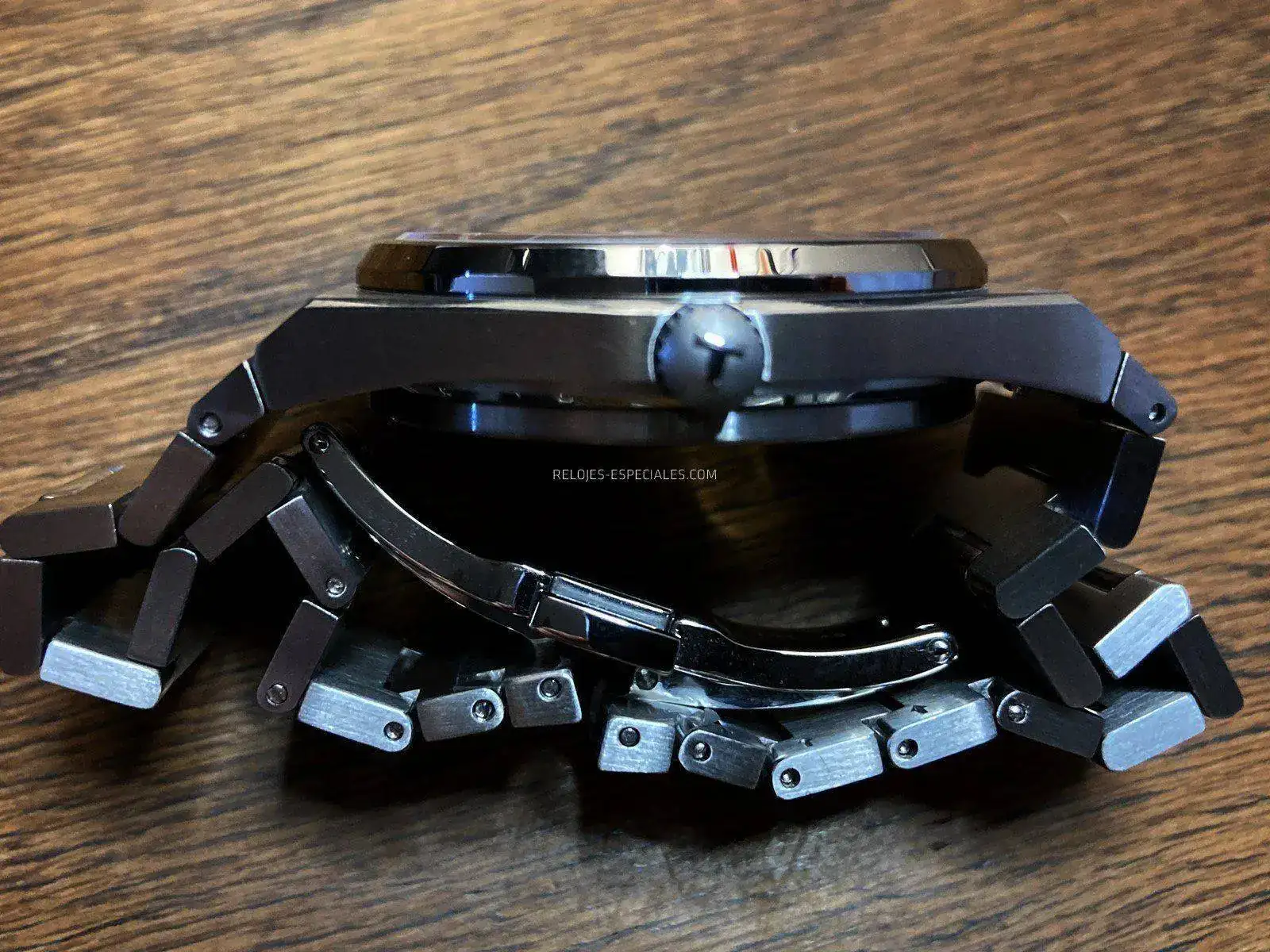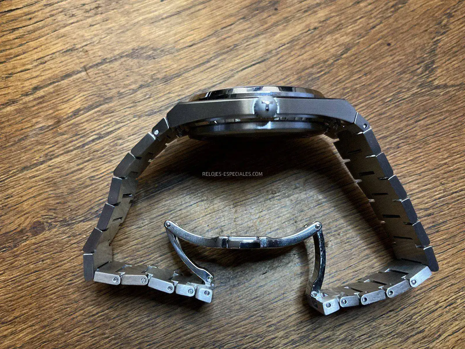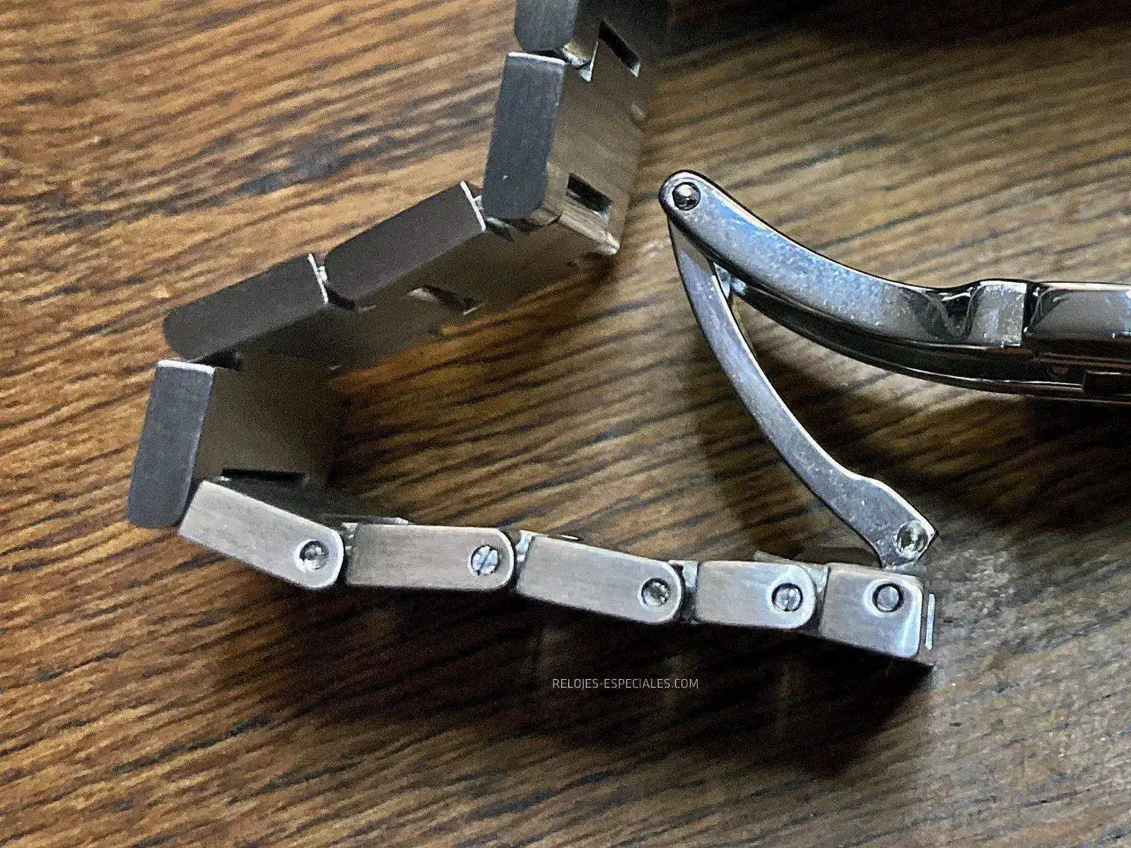 Cada extremo de la caja tiene su par de asas, pero reducidas a su mínima expresión, lo justo para poder alojar el primer eslabón del brazalete. Con dos excepciones, estos eslabones tienen todos la misma forma, sólo que van decreciendo en tamaño hasta llegar a la zona del cierre oculto. Las excepciones son precisamente los que enlazan (integran) el brazalete con la caja y que de alguna forma la prolonga, y los dos finales que encuentran el cierre de mariposa oculto, que son más pequeños y compensarían un microajuste del que el Tissot PRX carece.