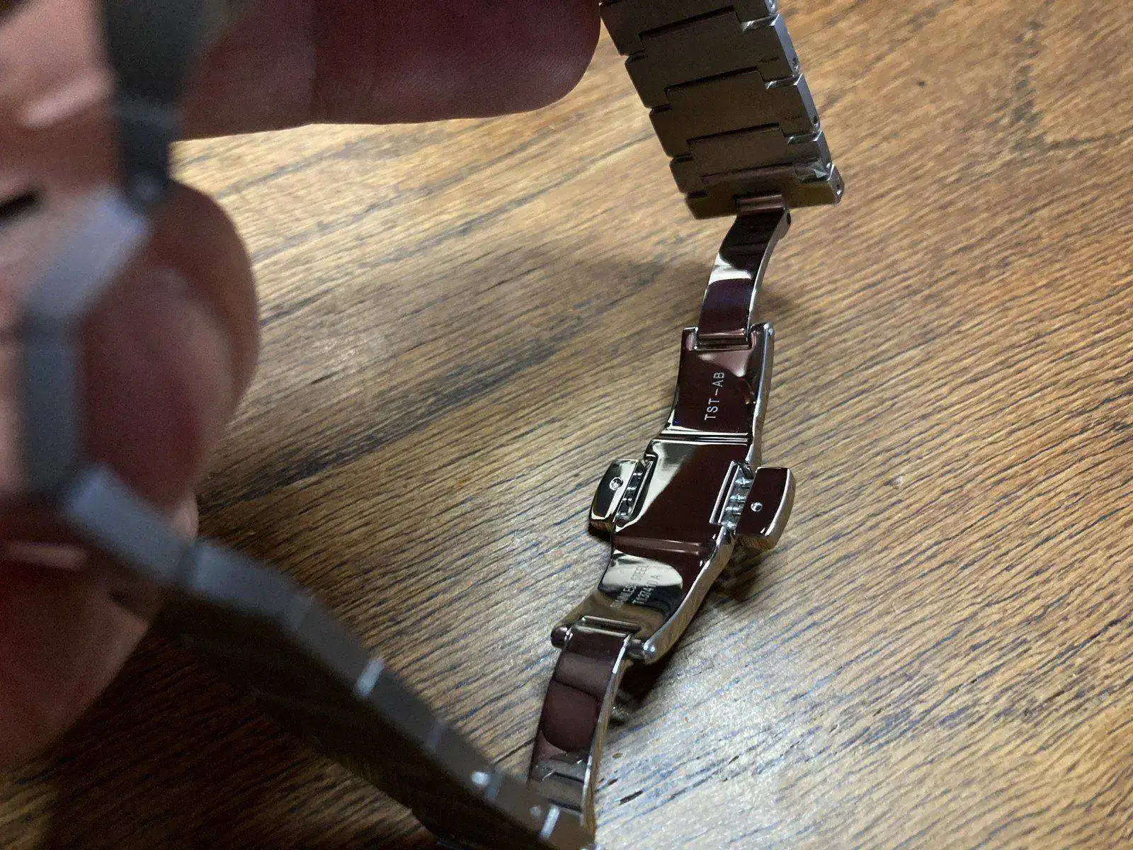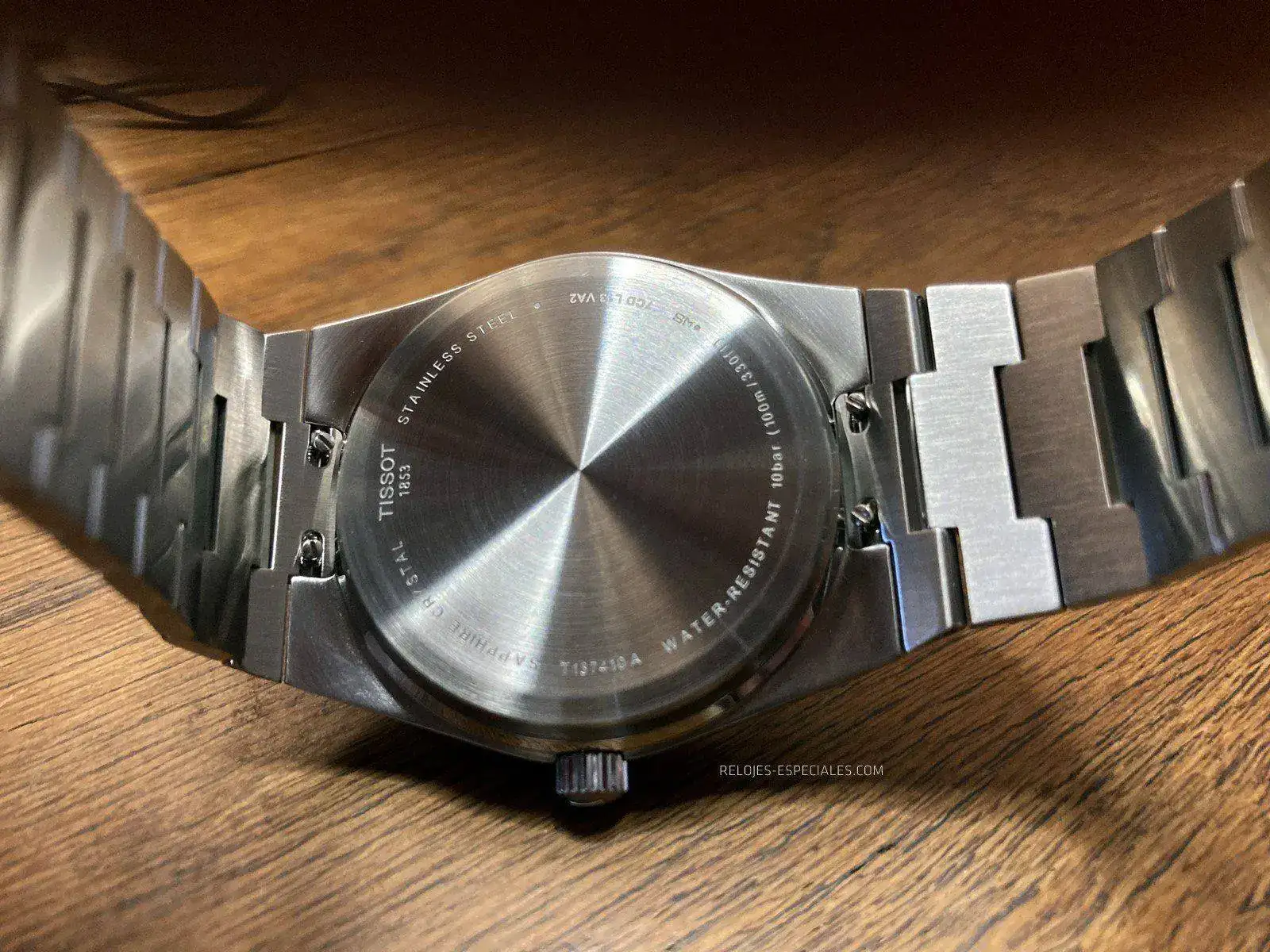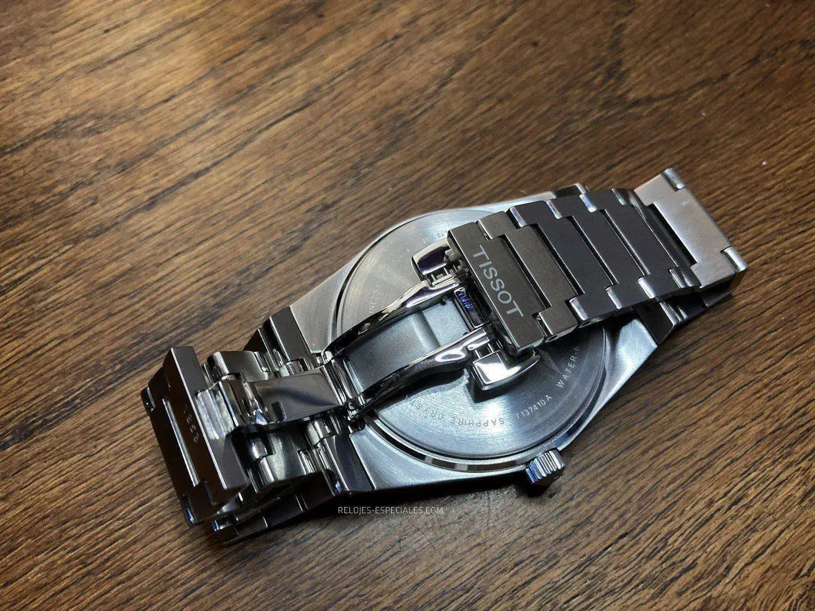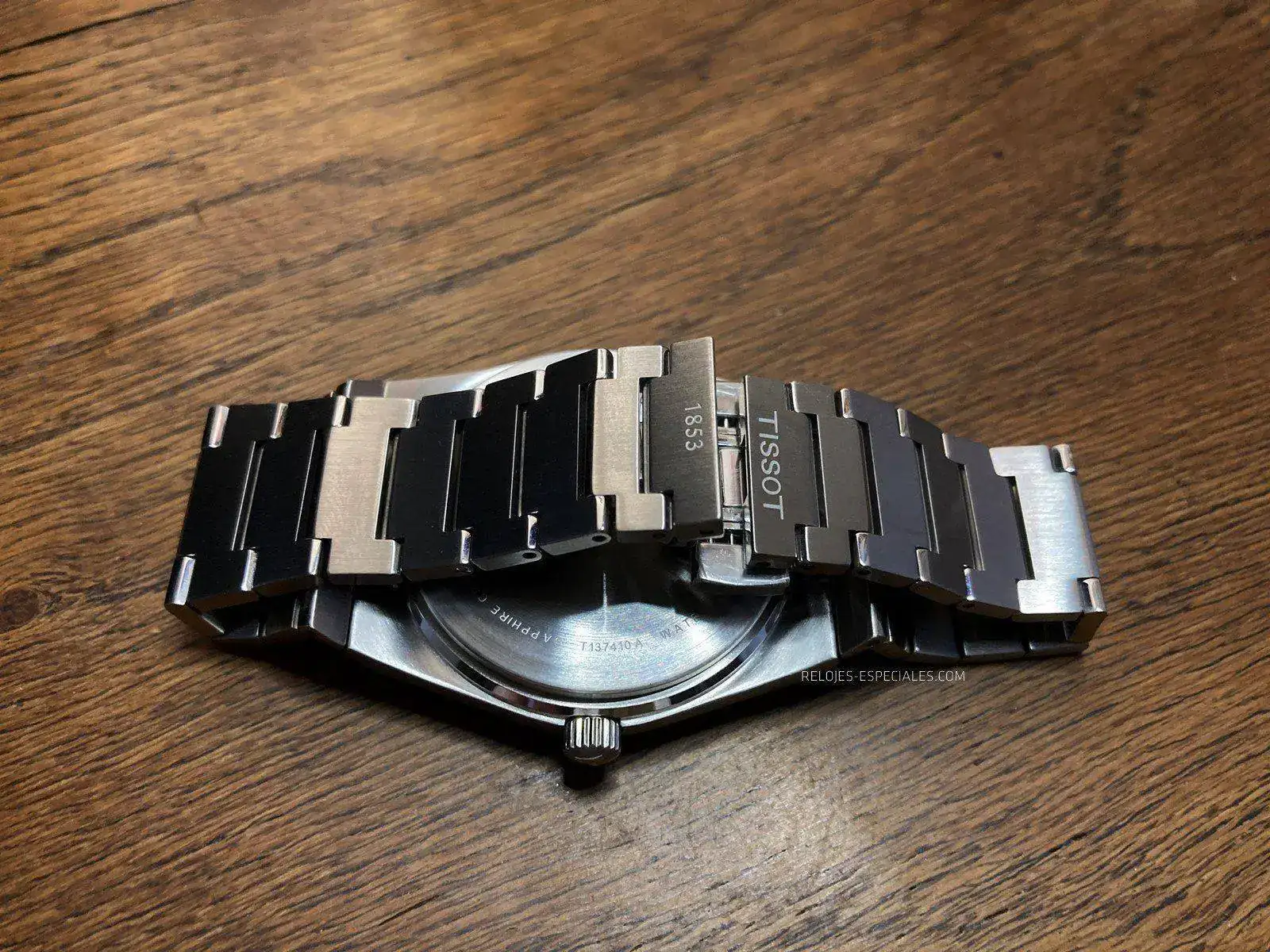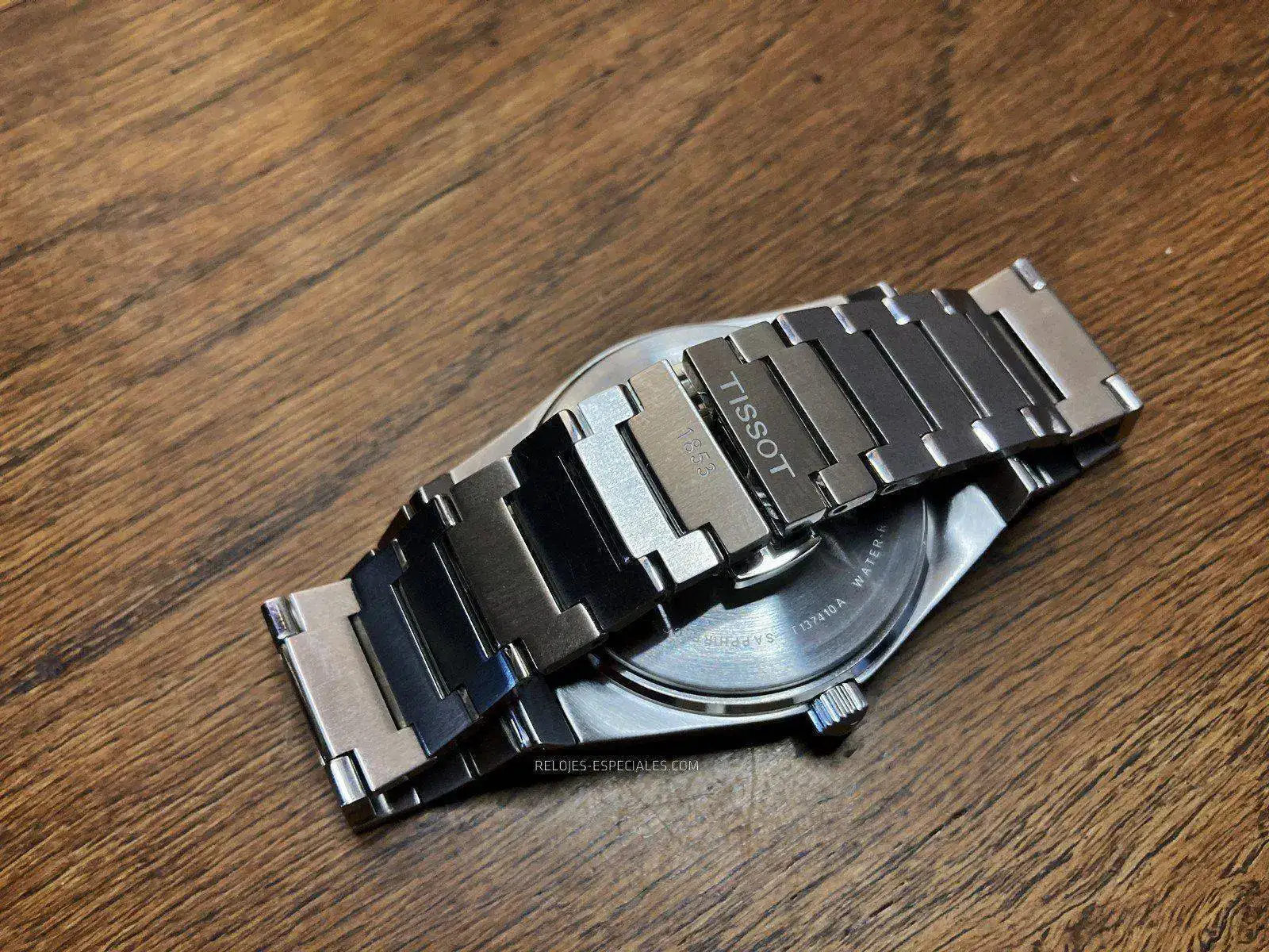 El brazalete es tal vez la parte más sorprendente -en positivo- del conjunto. Perfectamente adaptable al contorno de la muñeca, no pellizca ni la piel ni el vello de la misma. Como ya he dicho, sus eslabones siguen una progresión decreciente desde la caja hasta el cierre de mariposa accionado por dos pulsadores simultáneamente, bastante precisos, por cierto. Este cierre tiene dos características: los eslabones que quedan a la vista están grabados al láser con el logo TISSOT 1853 y, esto es lo más interesante, no tienen un orden preestablecido, lo que permite cerrarlos según nos venga bien o nuestra propia costumbre. Los pulsadores no molestan en absoluto en la muñeca y se accionan sin ninguna dificultad.